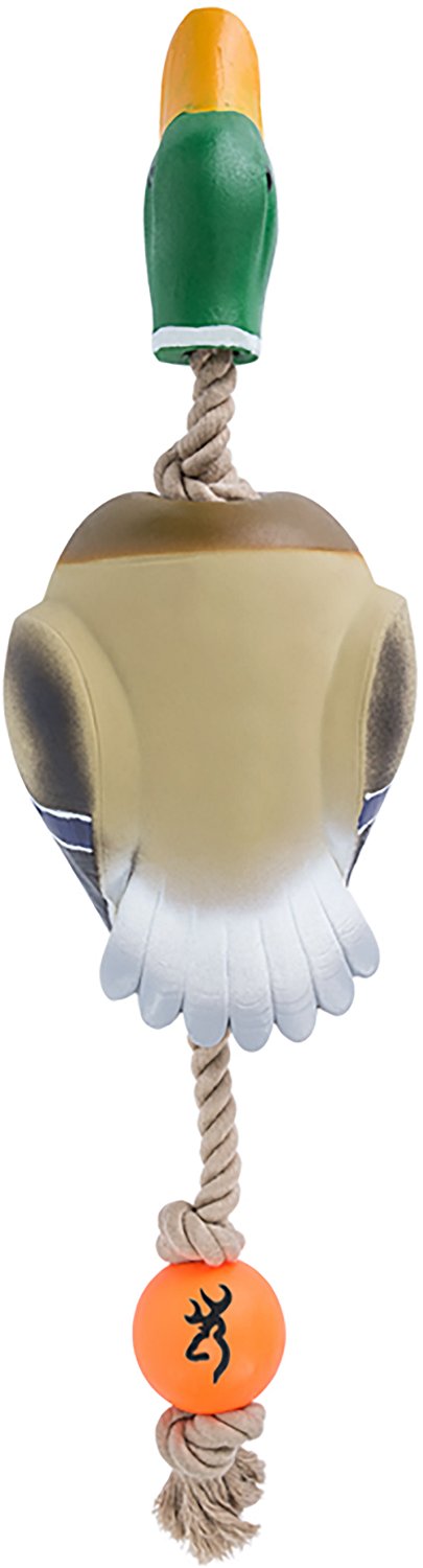 Teach your canine companion to fetch and retrieve using this Browning Duck Rope Toy, featuring a hard-wearing nylon rope with a rubber ball attached for easy throwing, plus a plastic duck and built-in treat grooves to pique and maintain their interest. 16.5 in. H x 4 in. W x 3 in. D.