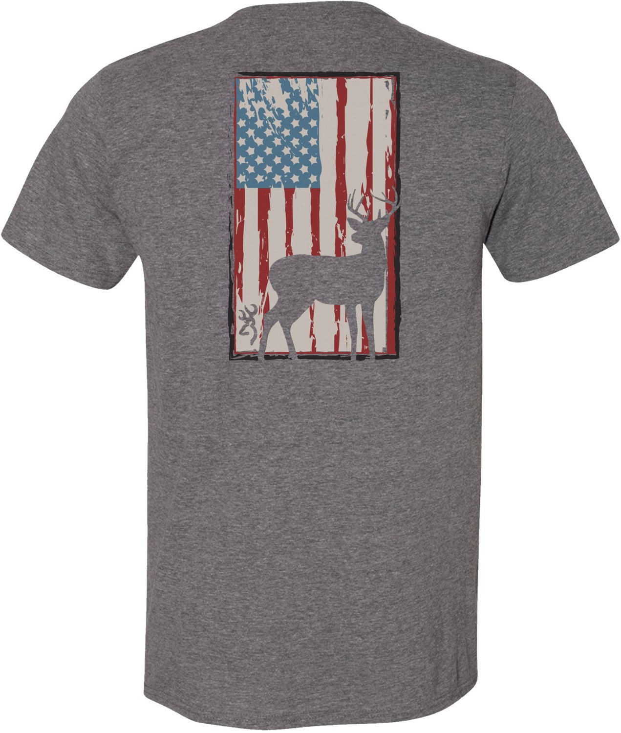 Stay comfortable outdoors, while relaxing and more in this Browning Men's Dee Flag Short Sleeve T-shirt. It is made of 50% cotton and 50% polyester for a blend of comfort and durability, and the shirt is designed with a crew neck for a relaxed feel. Features a deer graphic and an American flag graphic.