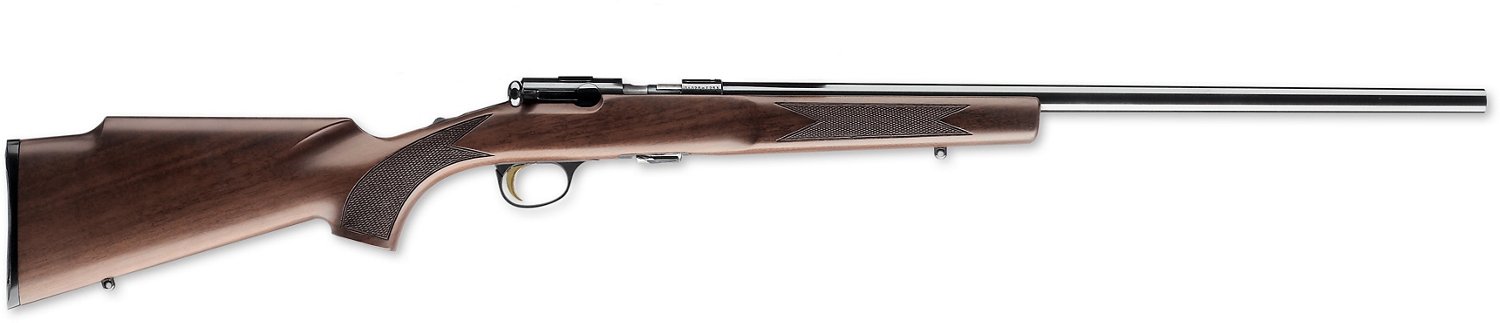 The Browning T-Bolt Target/Varmint .22 WMR Bolt-Action Rifle is made with a walnut stock and includes a heavy, free-floating barrel with a recessed crown muzzle and steel receiver. The adjustable trigger utilizes a tang safety. 10+1 ammo capacity.