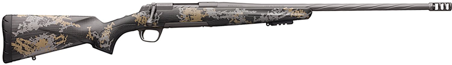 The Browning X-Bolt Mountain Pro .28 Nosler Bolt Action Rifle is bolt action and has a 3+1-round capacity. It's built with a fluted stainless steel barrel, stainless steel receiver and a carbon fiber stock. An adjustable feather trigger, tang safety and a Recoil Hawg muzzle brake complete the design.