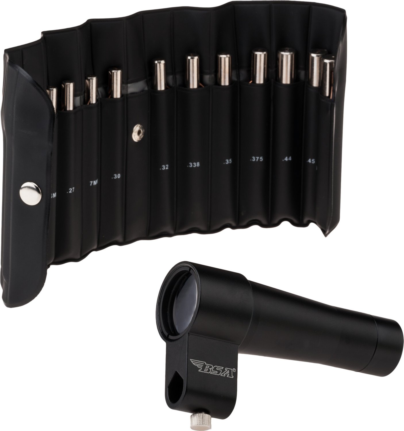 The BSA Bore Sighter Kit with Arbors will help you sight in a new rifle and scope combination while keeping your rifle's zero to help you hit your targets. The kit comes with 15 arbors of varying calibers all packaged in a heavy-duty case. Matte finish.