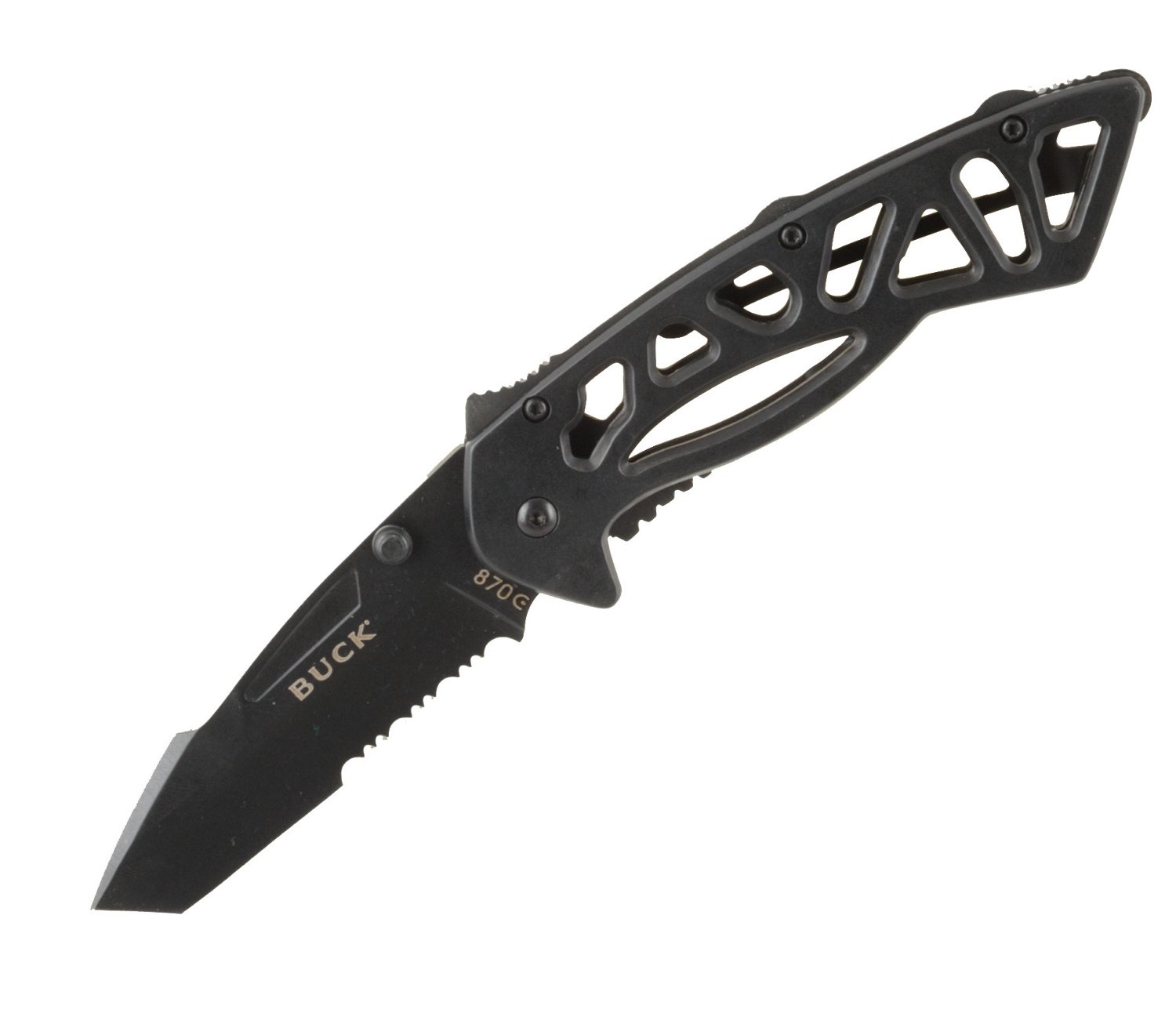 The Buck Bones® Knife features 420HC stainless-steel blade material for corrosion resistance and edge retention and a black oxide coating for a nonreflective surface. The frame-locking, partially serrated blade design promotes safe use, and the knife offers quick and reliable 1-handed, ambidextrous blade deployment. Removable pocket clip and lanyard hole for carrying convenience. 4.4 oz. 3" blade length. 7.63" overall length.