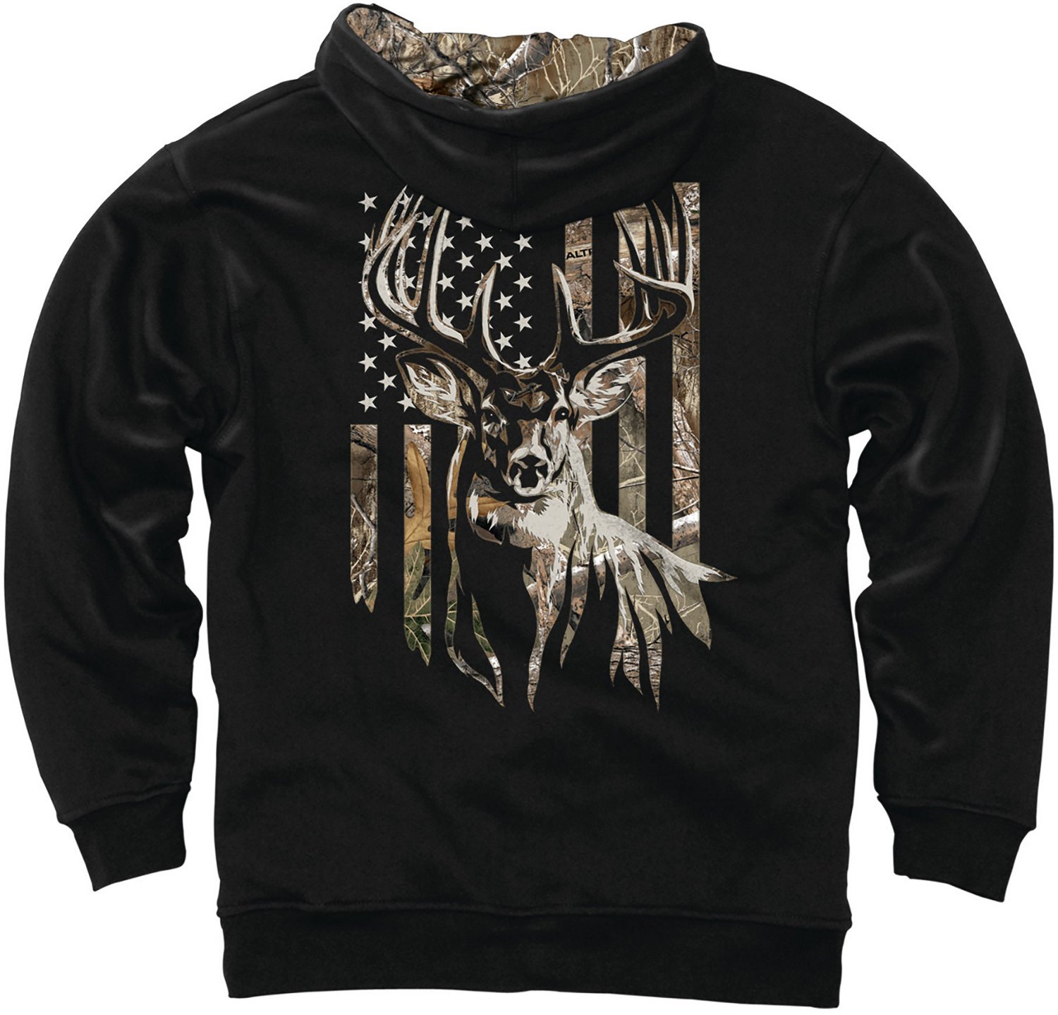Show off your love for your country and hunting with the Buck Wear Men's Camo Stag and Stripes Hoodie. The polyester and cotton construction helps keep you comfortable throughout the day, and the embroidered design adds an eye-catching touch of style.