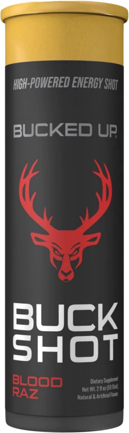 Shoot up your energy with the Bucked Up Buck Shot Blood Razz Energy Drink 2 oz. 200 milligrams of caffeine combine with nootropics and energy boosters to wake you up and help you focus. A fruit punch flavor and zero calories offer a guilt-free energy shot you can take when you need a little extra boost.