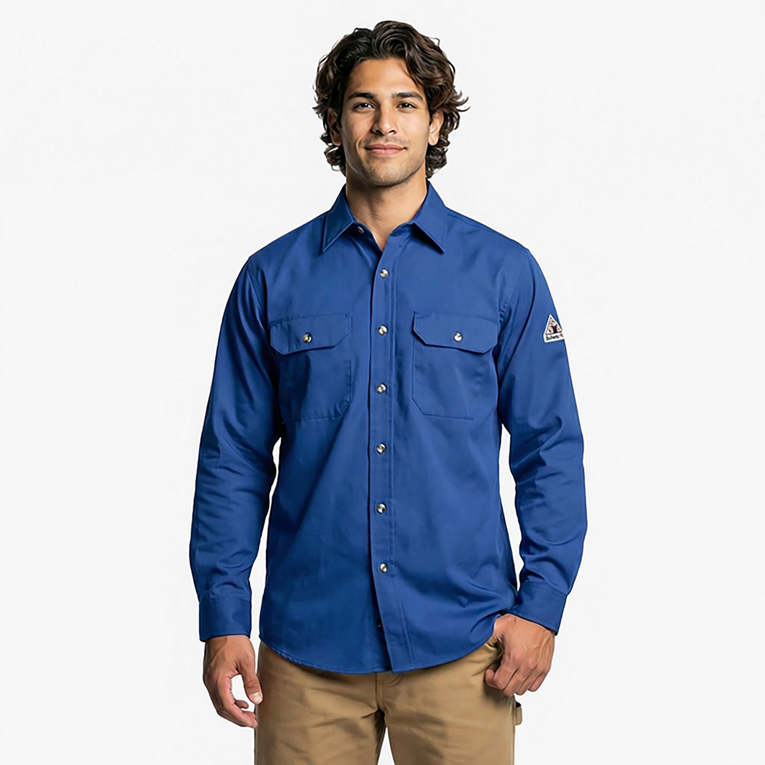 Get the tough jobs done in the Bulwark Men's EXCEL Flame Resistant ComforTouch Dress Uniform Shirt. The cotton/nylon blend with integrated Westex Ultrasoft® fabric offers comfort, durability and flame resistance, while the button-down closure and tailored-placket sleeves promote a stylish and professional appearance as you go through your day.