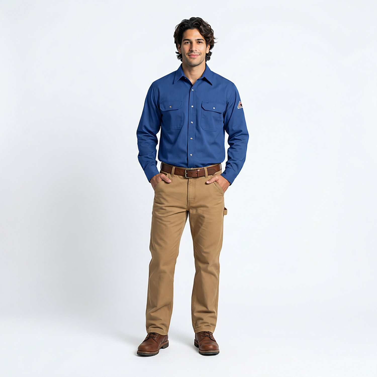 Suitable for hazardous work conditions, the Bulwark Men's Lightweight Nomex Flame Resistant Snap Flame Resistant ont Shirt is compliant with CAT 1 and NFPA® 2112 standards. It's tailored to give you a professional look and comes with 2 chest pockets with snaps. Regular fit.