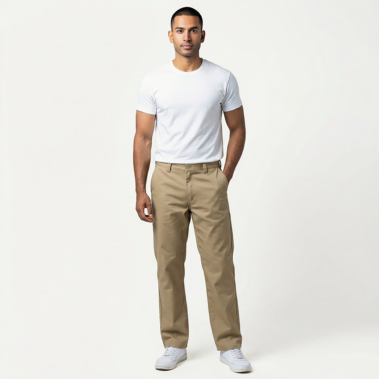 Sits just below the waist with room in the seat and thigh and is fuller at the leg for a classic look