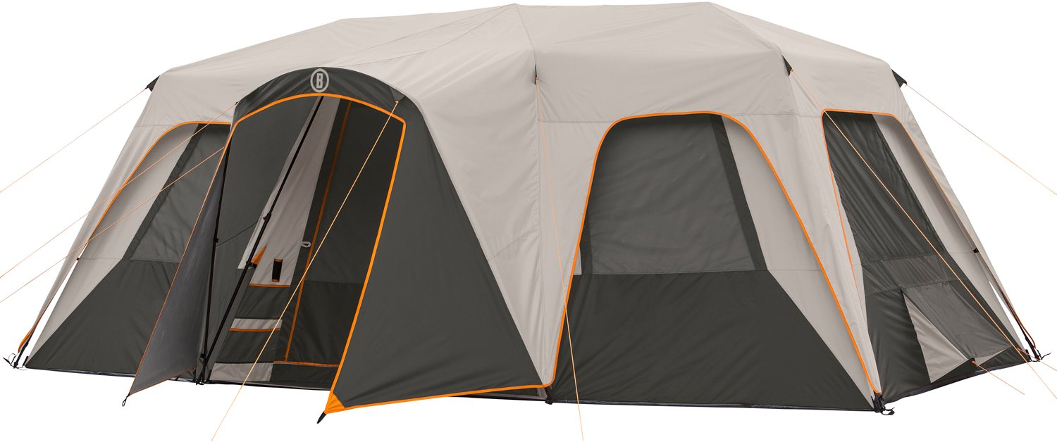 Camp without feeling cramped with the Bushnell 12 Person Instant Cabin Tent. The 80-inch center height offers plenty of room to stand up, and the large floor space accommodates two queen-sized air beds. A utility port allows for connection to outside electrical access for convenient powering of accessories and phone charging. A reflective coating on the rainfly helps keep the tent dark and cool, while taped seams and water-repellent fabric keep you dry.