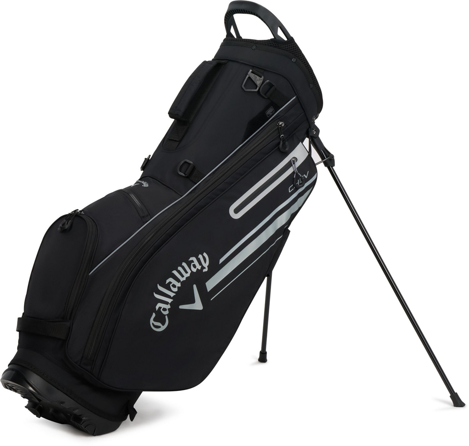 Keep your clubs and accessories convenient with the Callaway 2023 Chev Standing Bag. This updated bag features sturdy water-resistant material and 4-way club organization. Velour lined pockets protect your valuables while an accessory loop keeps your gloves easy for access.