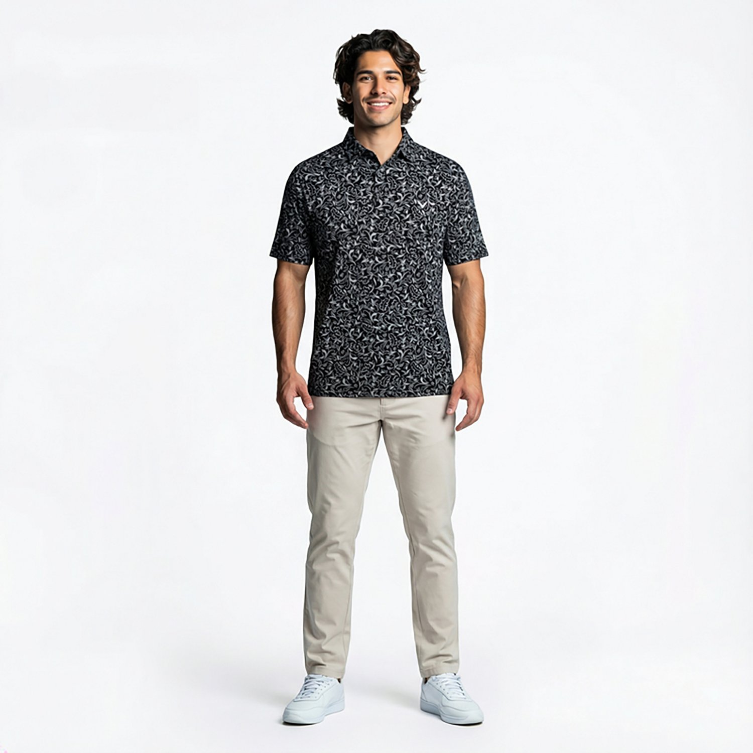 Look your best in the Callaway Men's Floral Print Short Sleeve Polo Shirt. It is made of 95% polyester and 5% spandex. The Opti-driâ„¢ technology wicks away moisture to keep you dry, and its stretch fit gives you a full range of motion. The fabric provides UV protection.