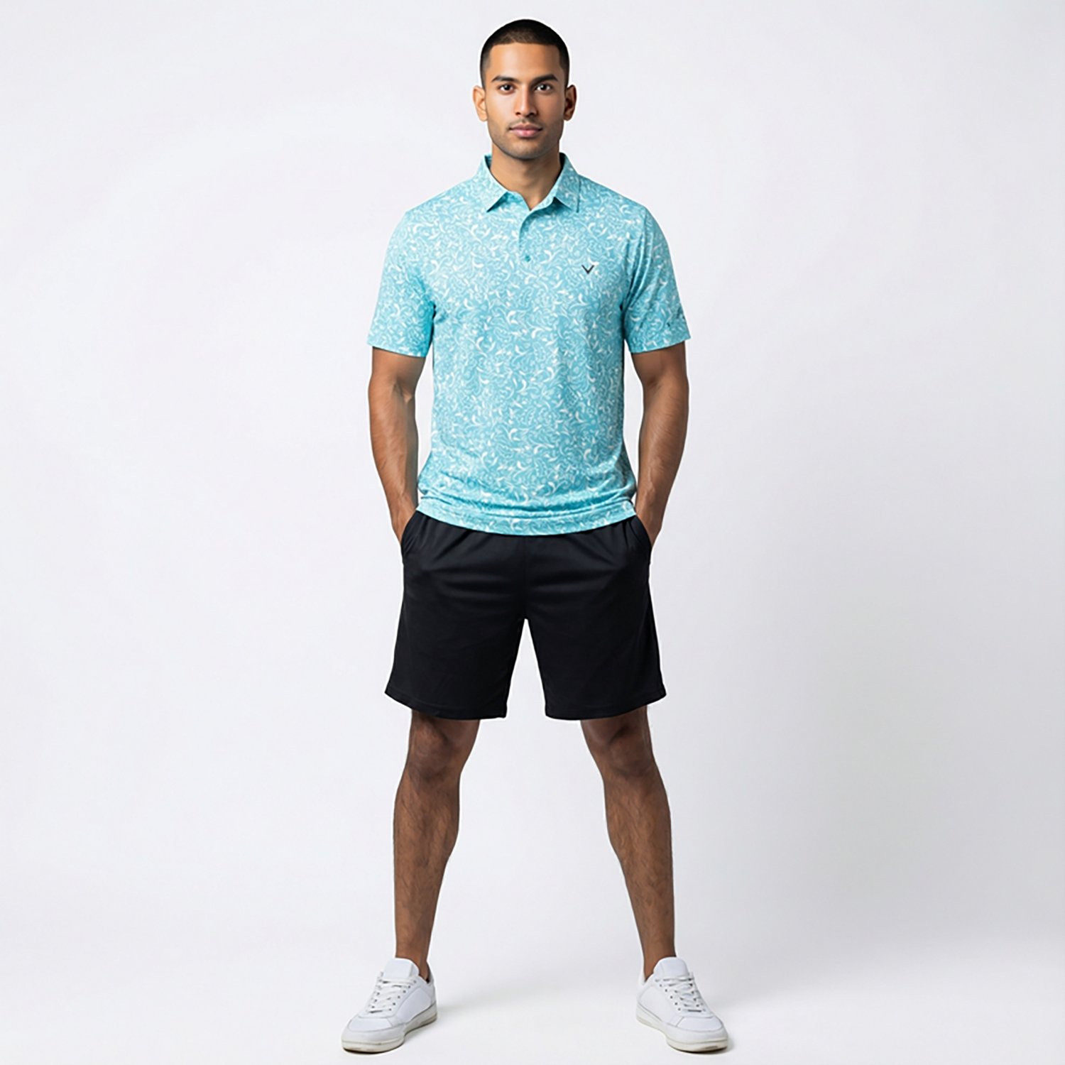 Look your best in the Callaway Men's Floral Print Short Sleeve Polo Shirt. It is made of 95% polyester and 5% spandex. The Opti-driâ„¢ technology wicks away moisture to keep you dry, and its stretch fit gives you a full range of motion. The fabric provides UV protection.