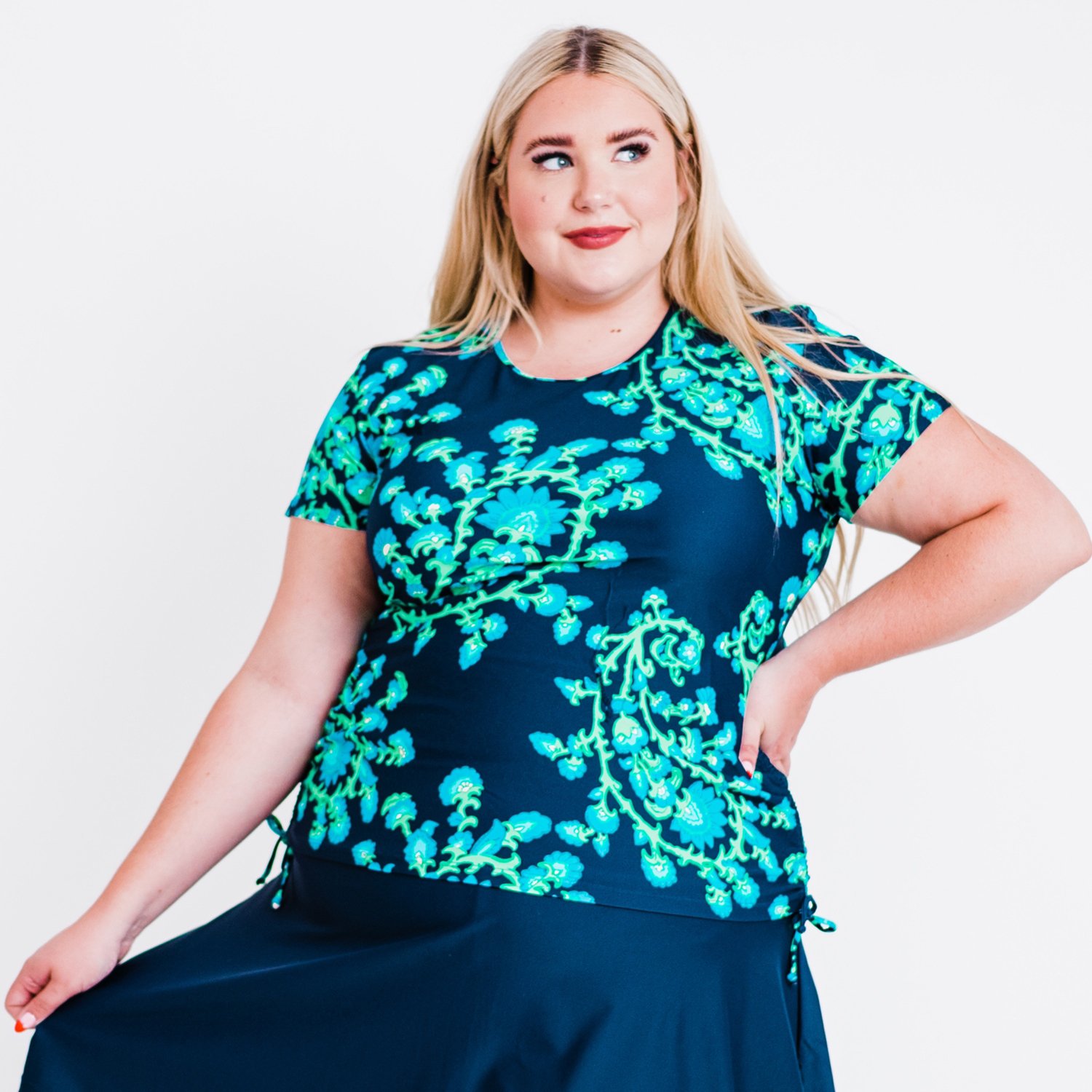 Beat the heat in the Calypsa Women's Adele Plus Size Swim Top. The nylon and spandex construction promotes comfort and dries quickly, and the tie-dye appearance and side ruching provide an eye-catching design.