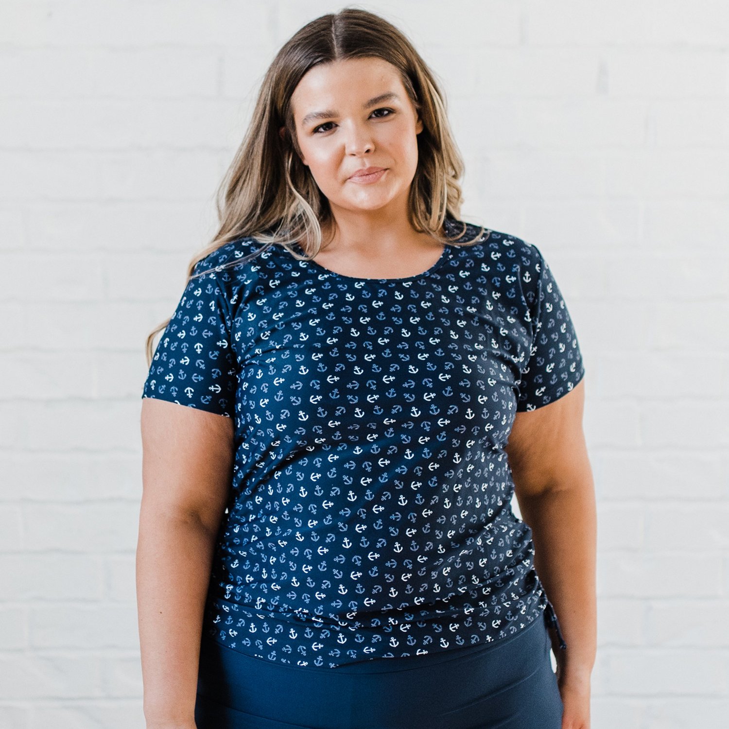 Beat the heat in the Calypsa Women's Adele Plus Size Swim Top. The nylon and spandex construction promotes comfort and dries quickly, and the tie-dye appearance and side ruching provide an eye-catching design.