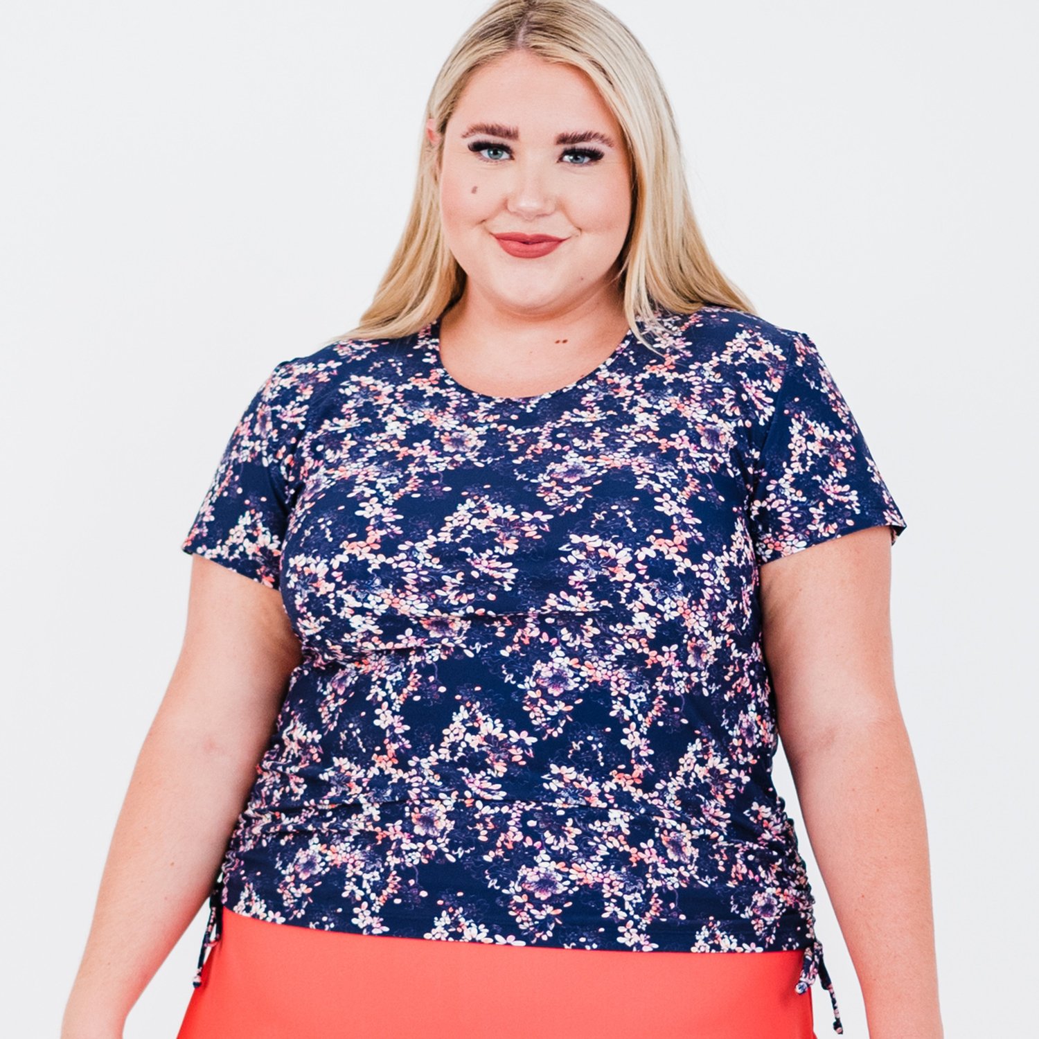Beat the heat in the Calypsa Women's Adele Plus Size Swim Top. The nylon and spandex construction promotes comfort and dries quickly, and the tie-dye appearance and side ruching provide an eye-catching design.