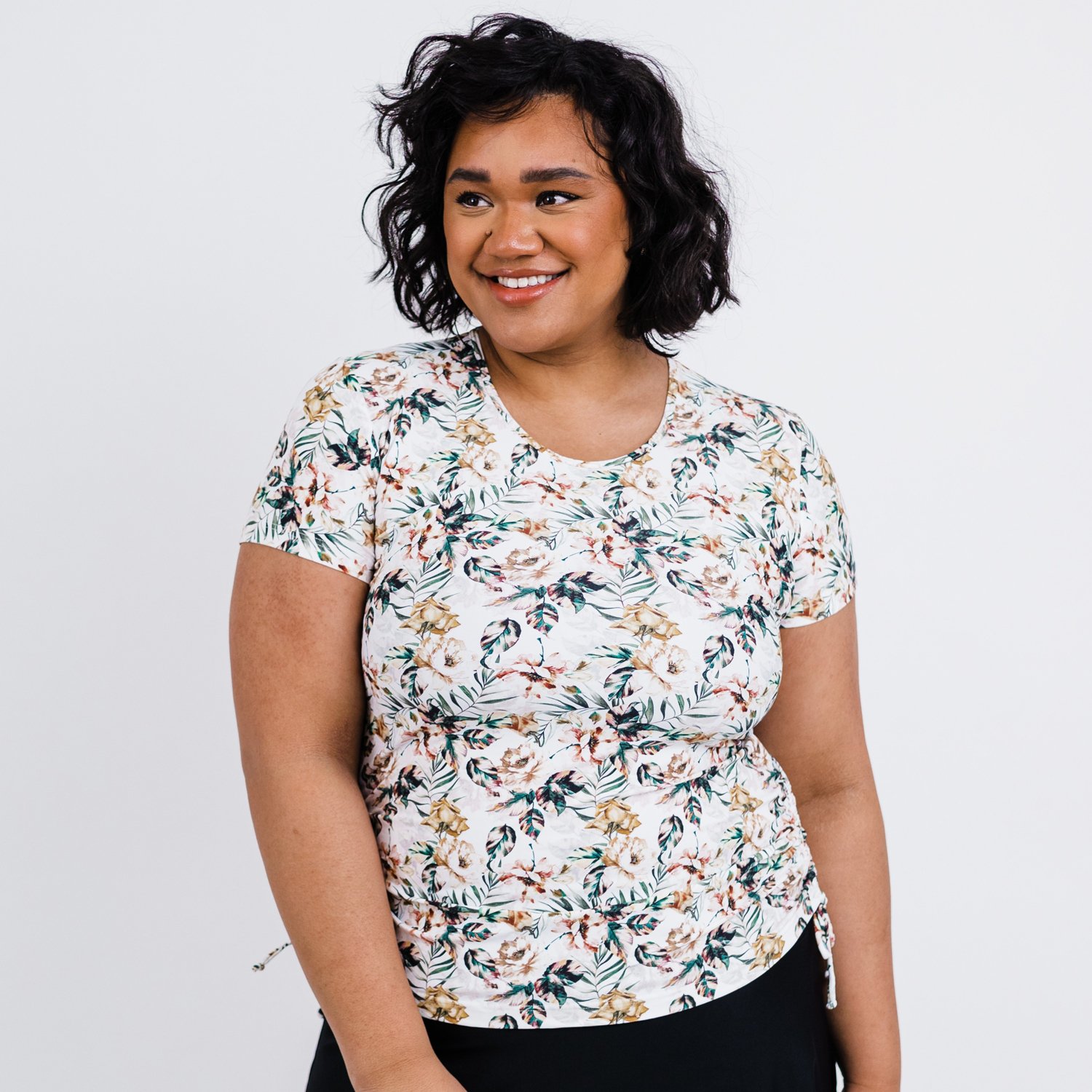 Beat the heat in the Calypsa Women's Adele Plus Size Swim Top. The nylon and spandex construction promotes comfort and dries quickly, and the tie-dye appearance and side ruching provide an eye-catching design.