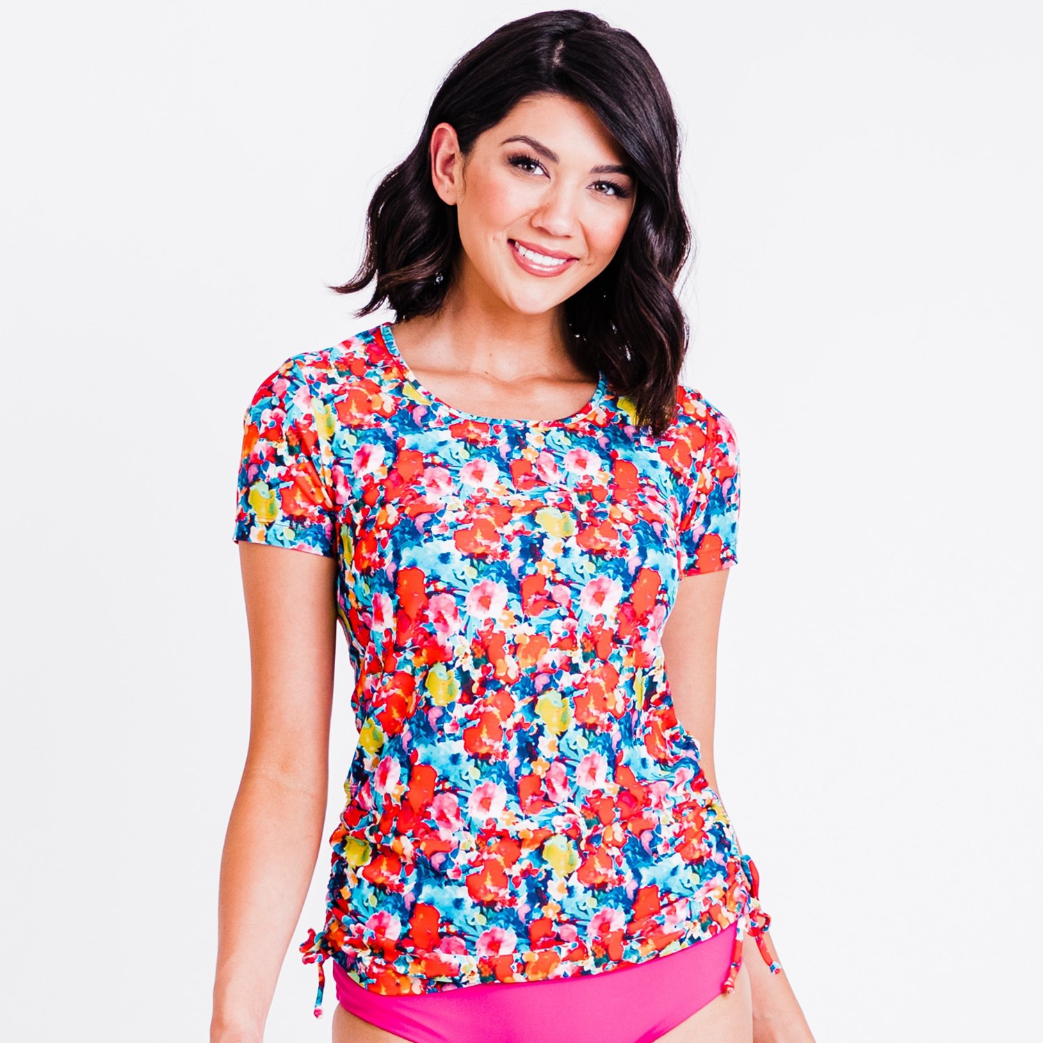 Beat the heat in the Calypsa Women's Adele Swim Top. The nylon and spandex construction promotes comfort and dries quickly, and the tie-dye appearance and side ruching provide an eye-catching design.