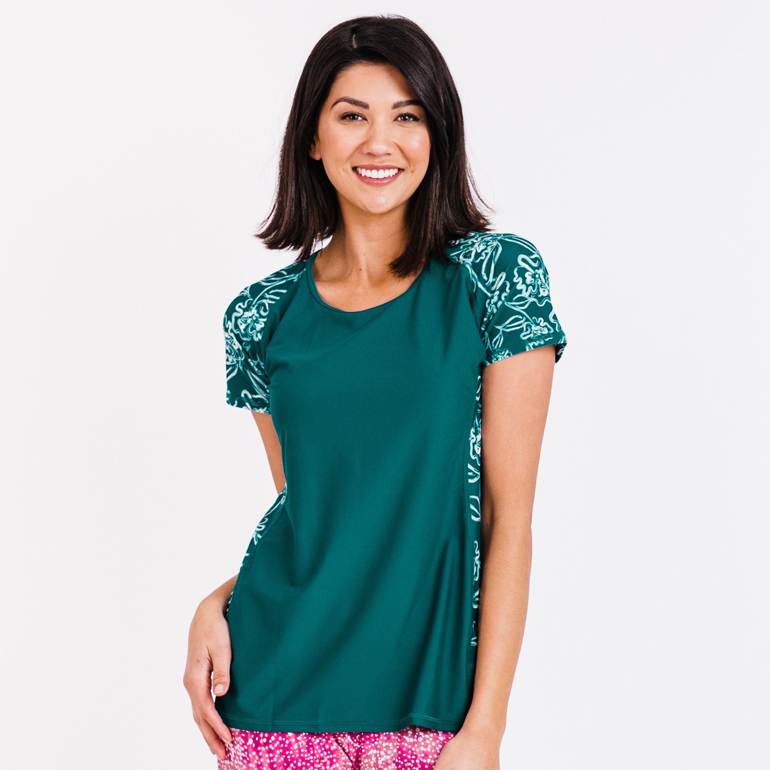 Beat the heat in the Calypsa Women's Loose Fit Adele Swim Top. The nylon and spandex construction promotes comfort and dries quickly, and the side panels provide an eye-catching design.