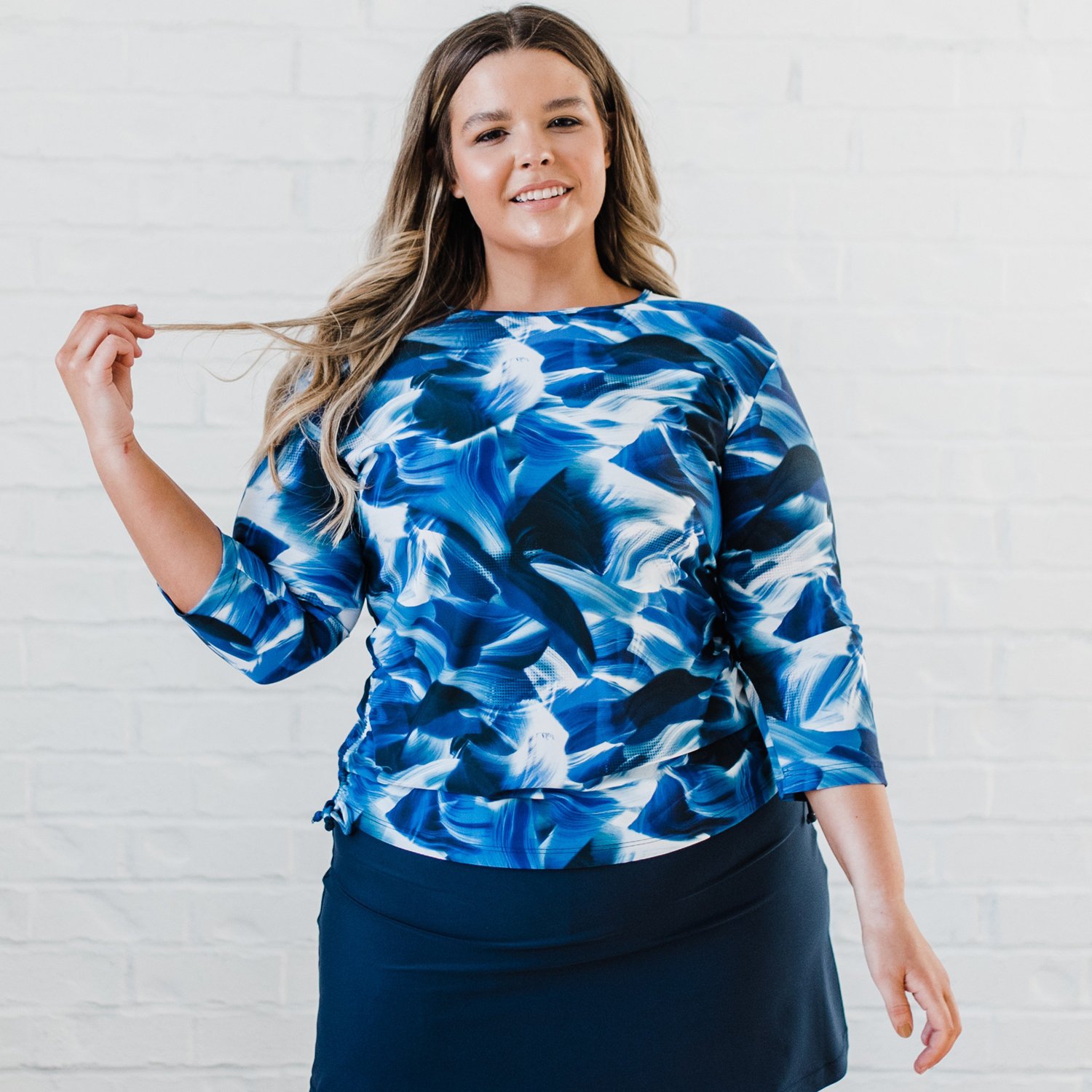Enjoy your day at the beach in comfortable style with the Calypsa Women's Margaux Plus-Size Swim Top. This lightweight swim top is made of a blend of nylon and spandex for comfort and durability. The 3/4-length sleeves, slimming side ruching and rounded neckline add personality, and the quick-drying material also protects from UV rays.