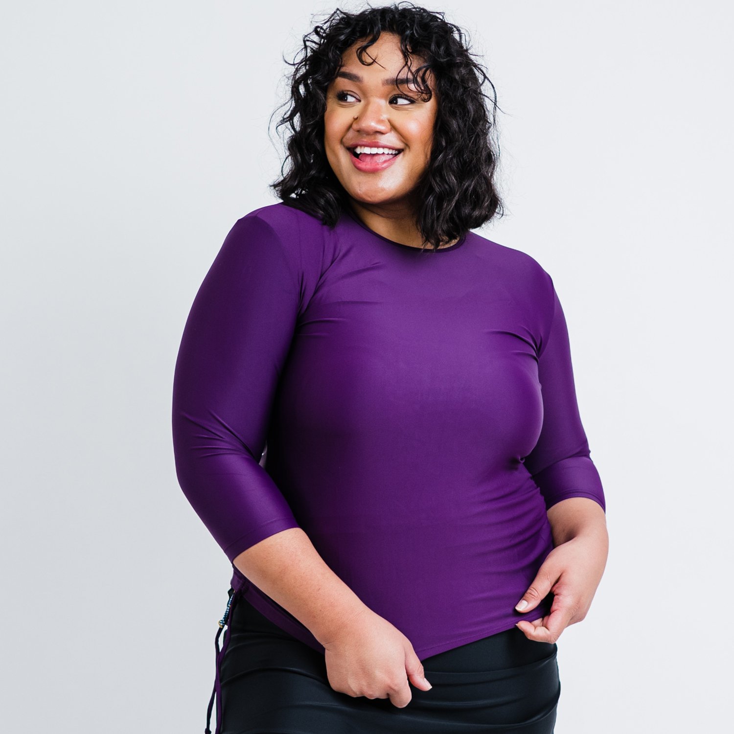 Enjoy your day at the beach in comfortable style with the Calypsa Women's Margaux Plus-Size Swim Top. This lightweight swim top is made of a blend of nylon and spandex for comfort and durability. The 3/4-length sleeves, slimming side ruching and rounded neckline add personality, and the quick-drying material also protects from UV rays.