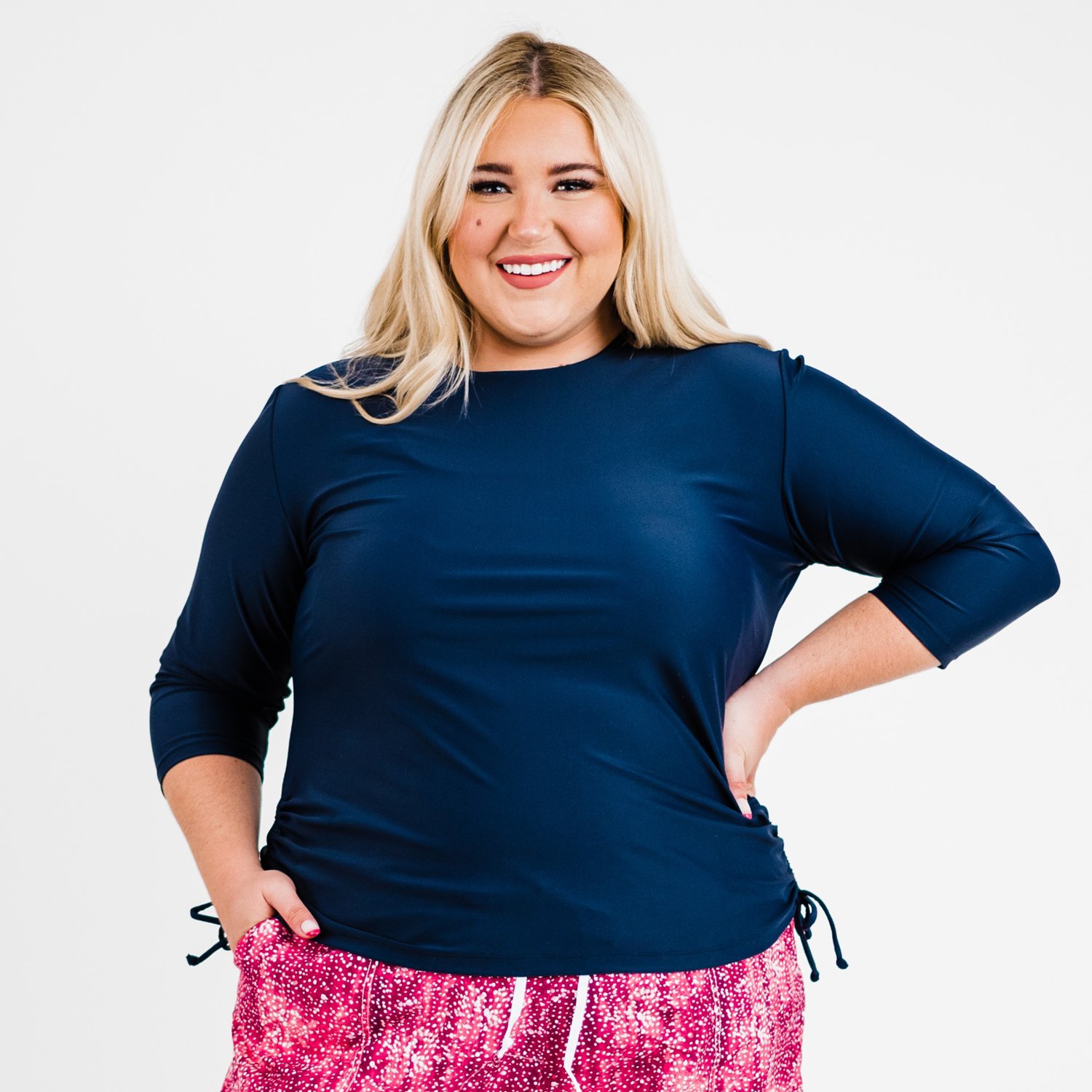 Enjoy your day at the beach in comfortable style with the Calypsa Women's Margaux Plus-Size Swim Top. This lightweight swim top is made of a blend of nylon and spandex for comfort and durability. The 3/4-length sleeves, slimming side ruching and rounded neckline add personality, and the quick-drying material also protects from UV rays.