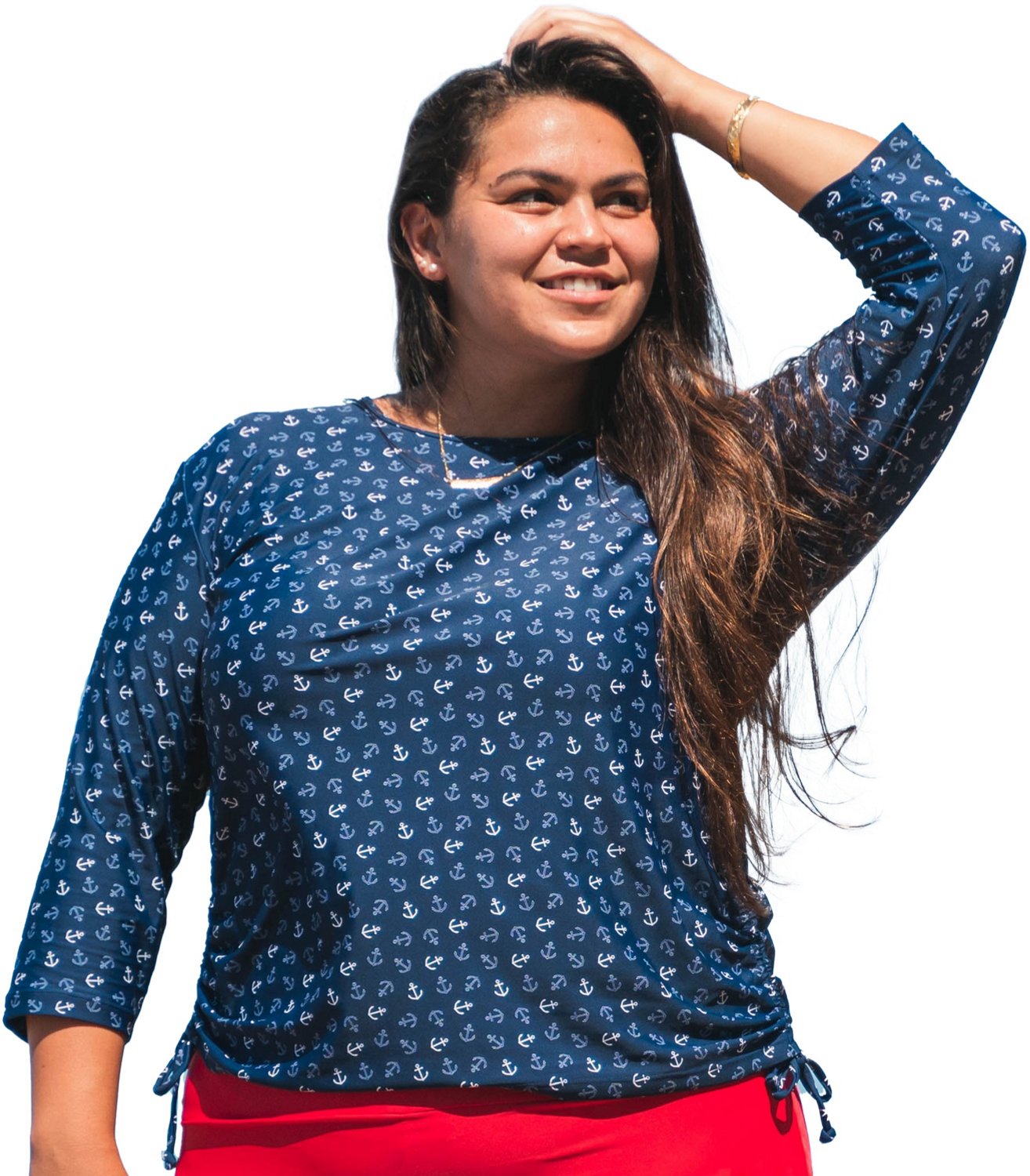 Enjoy your day at the beach in comfortable style with the Calypsa Women's Margaux Plus-Size Swim Top. This lightweight swim top is made of a blend of nylon and spandex for comfort and durability. The 3/4-length sleeves, slimming side ruching and rounded neckline add personality, and the quick-drying material also protects from UV rays.
