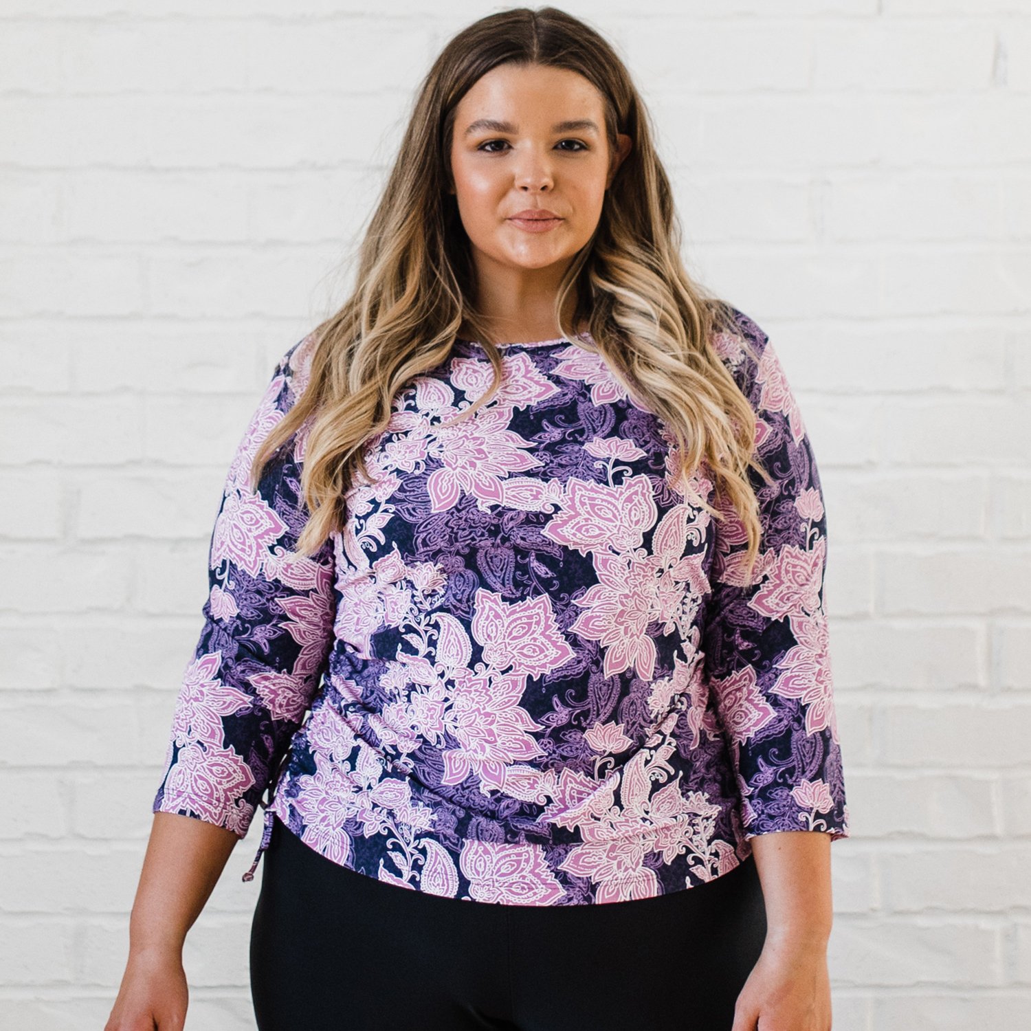 Enjoy your day at the beach in comfortable style with the Calypsa Women's Margaux Plus-Size Swim Top. This lightweight swim top is made of a blend of nylon and spandex for comfort and durability. The 3/4-length sleeves, slimming side ruching and rounded neckline add personality, and the quick-drying material also protects from UV rays.