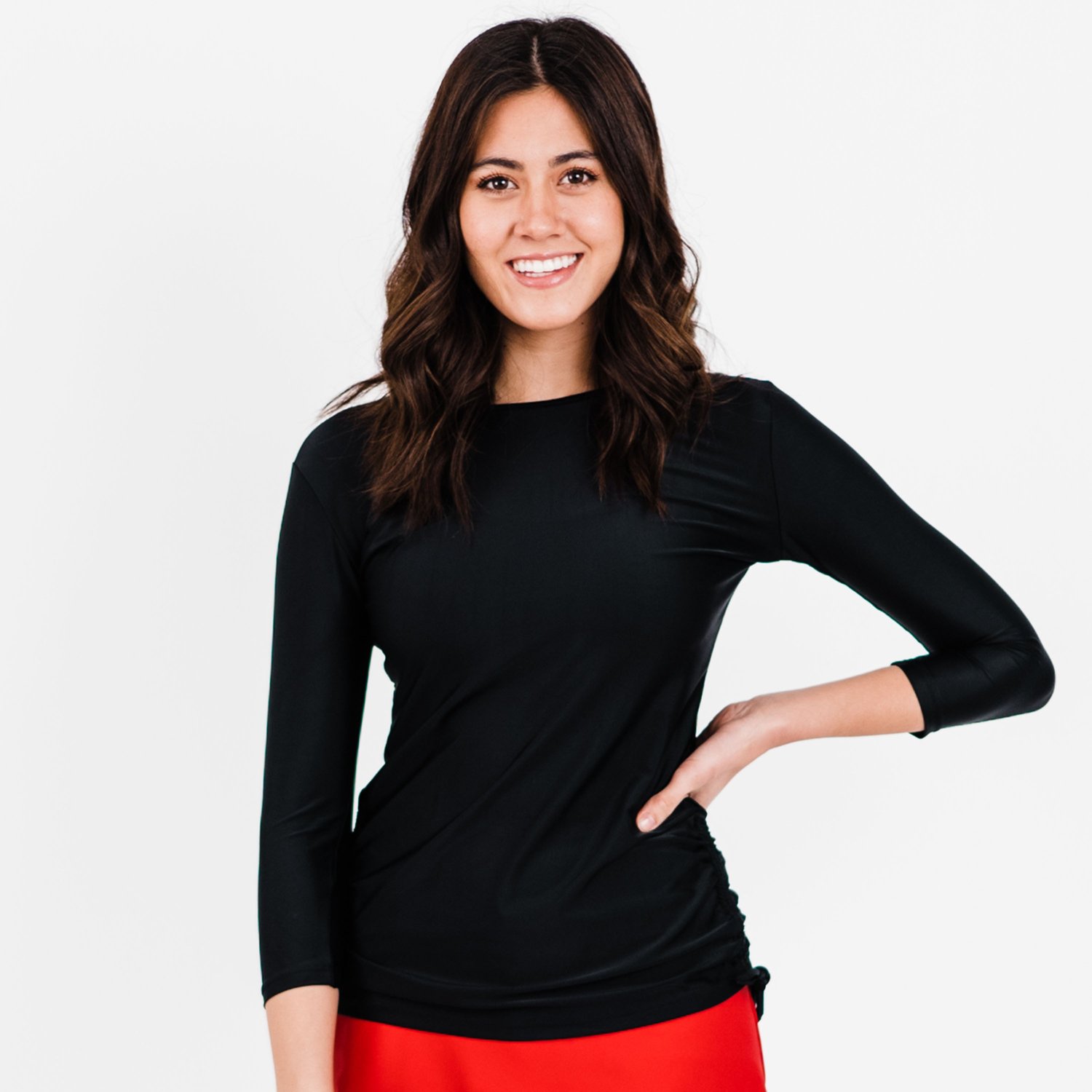 Get ready for the pool or beach with the Calypsa Women's Margaux Swim Top. The soft, stretchy fabric provides UPF 50+ sun protection and dries quickly for comfort in or out of the water. Ruched sides create a flattering fit.