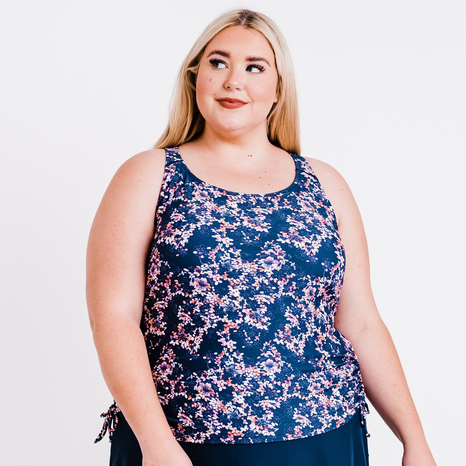 Enjoy your beach day in comfort and style in the Calypsa Women's Maya Tankini Plus-Size Swim Top with Removable Cups. This swim top has a stylish round neckline and slimming side ruching that creates a flattering look. The blend of nylon and spandex provides durability, comfort and UV protection, while the built-in bar with removable cups adds extra bust support. Pair with your favorite swim bottoms (not included) to customize your look.