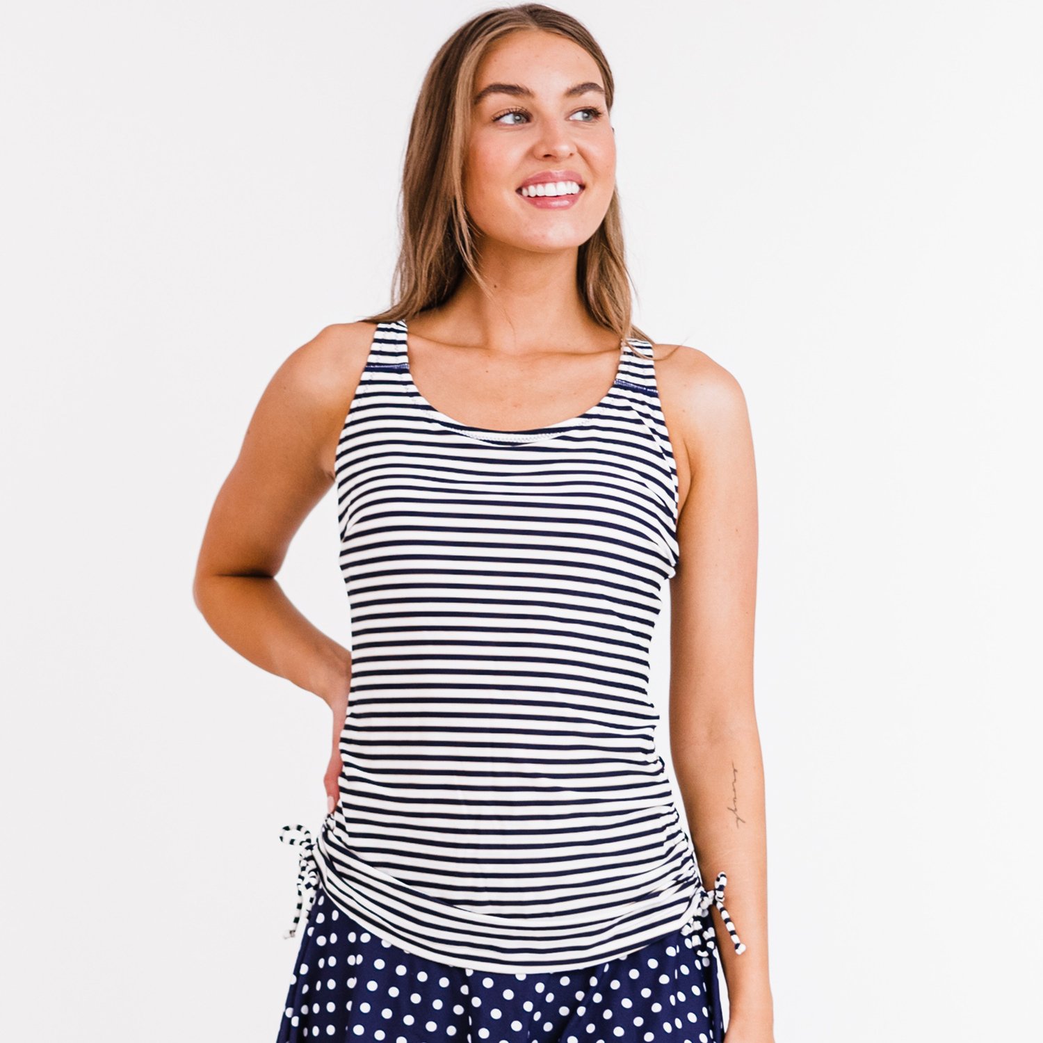 Whether swimming, lounging, or anything between, do it while looking great in the Calypsa Women's Maya Tankini Swim Top. This tankini top features a built-in bra with removable cups for support. Ruched sides create a slimming effect. Stretch fabric lets you move easily, dries out quickly and provides UPF 50+ sun protection.