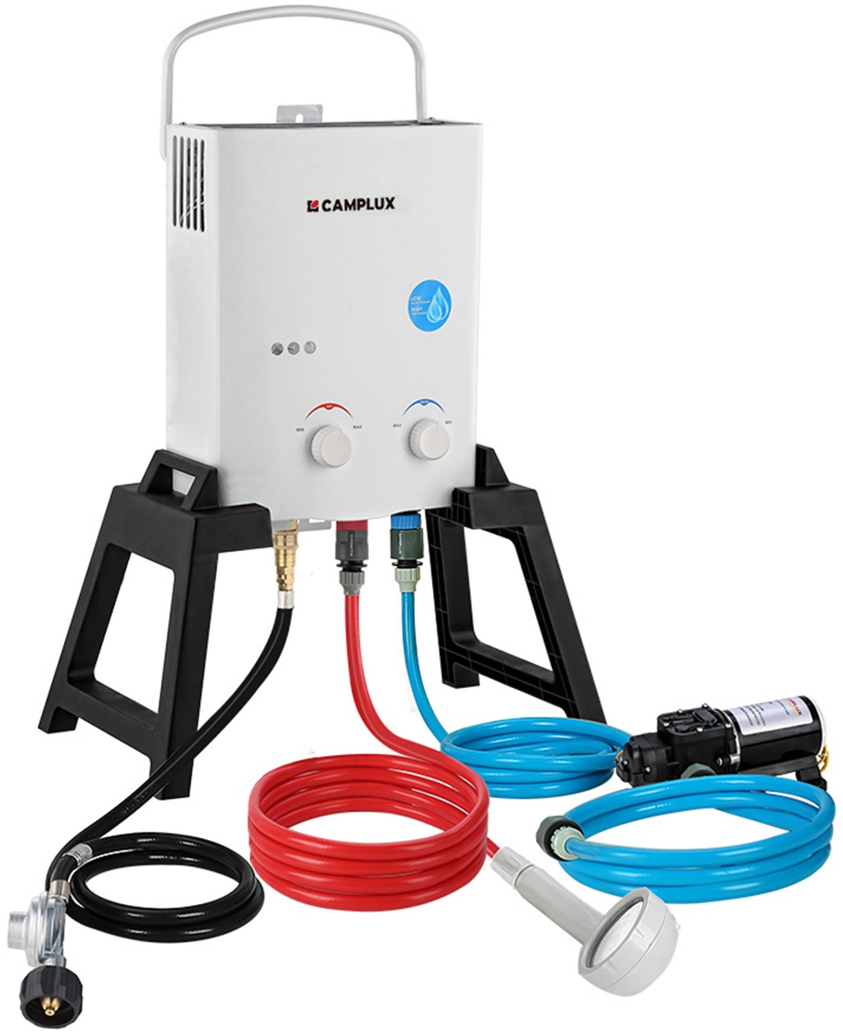 Make sure you have warm water for your outdoor shower with the CampLux Outdoor Propane 1.32 GPM Tankless Water Heater with Stand and Storage Bag. This water heater provides 34,000 British thermal units of heat to supply hot water on demand, and the stainless steel construction remains resilient in the outdoors. A shower head and hose let you shower with ease after a long day of adventuring, and the handle lets you easily pick up and take the heater with you wherever hot water is needed.