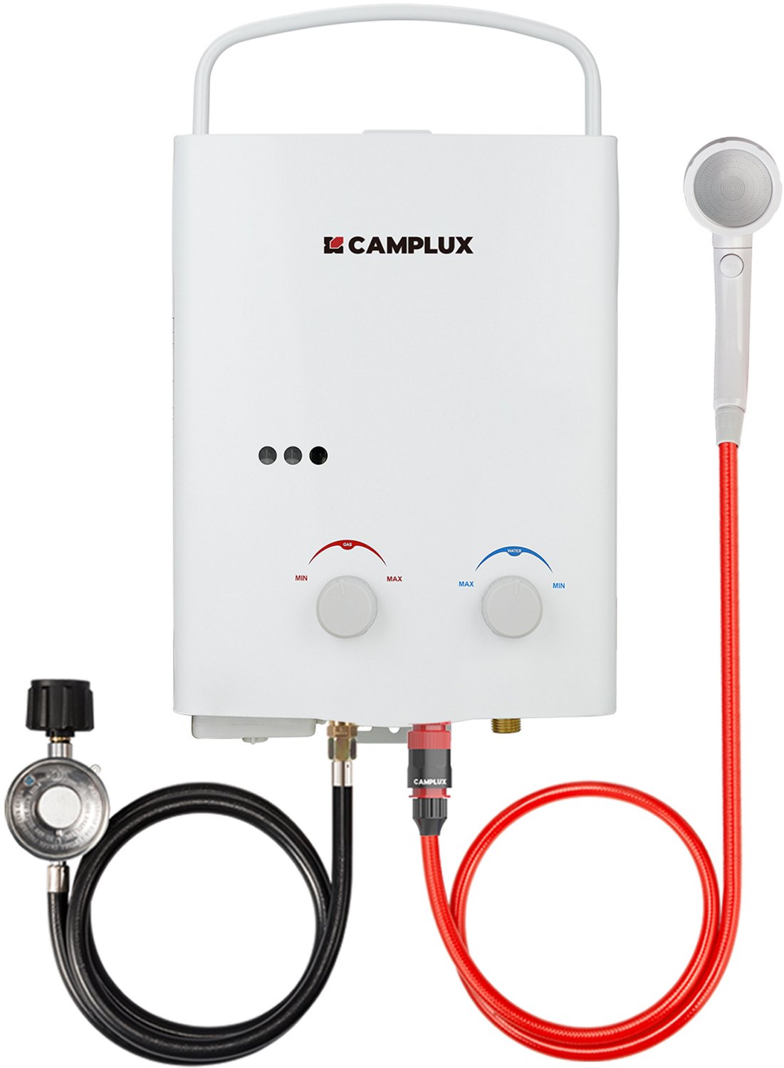 5-foot gas regulator, shower hose and US garden hose for easy installation