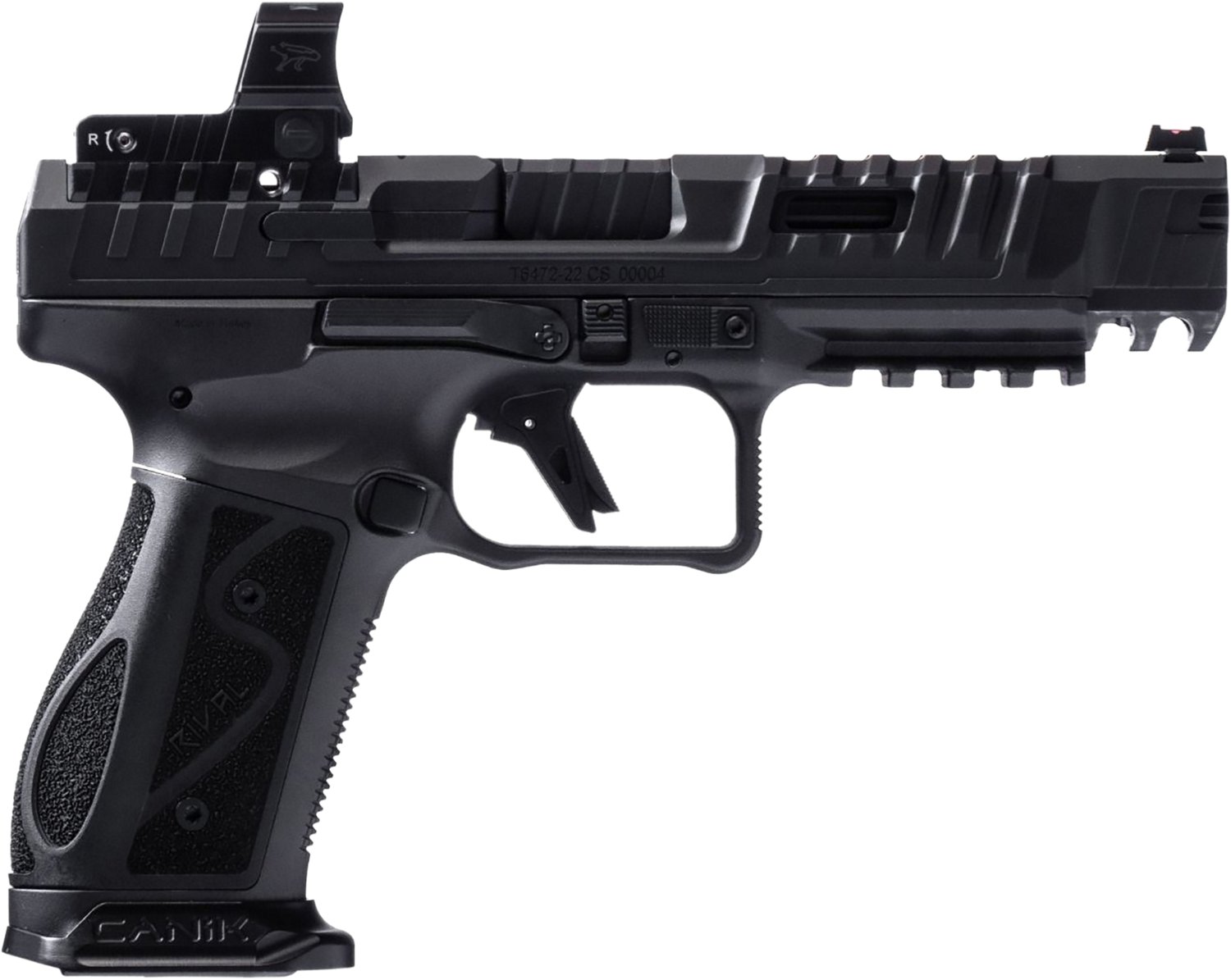 The Canik SFX Rival-S 9mm Luger Pistol features a steel frame with a dark side finish, a steel barrel and a serrated steel slide with ports. The semiautomatic pistol is designed with a MeCanik MO2 red dot optic and comes with a variety of accessories, including a holster and magazines.