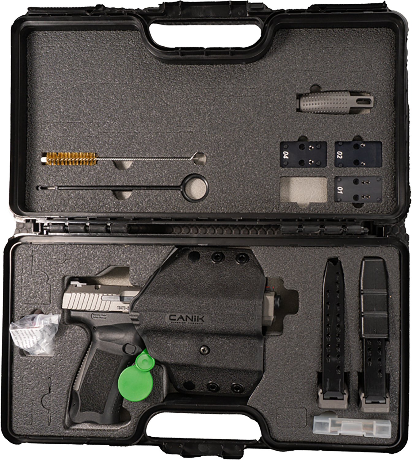Designed with a 5.2-inch match-grade barrel, the Canik TP9SFx 9mm Luger Semiautomatic Pistol has a serrated slide with lightning cuts, a Warren fiber-optic front sight and a striker status indicator. The slide stop is extended and ergonomically designed, and the magazine catch is adjustable and reversible. MIL-STD 1913 Picatinny rail. Includes two 20-round magazines, a polymer holster with paddle/belt attachments, interchangeable backstraps, a cleaning rod and a brush.