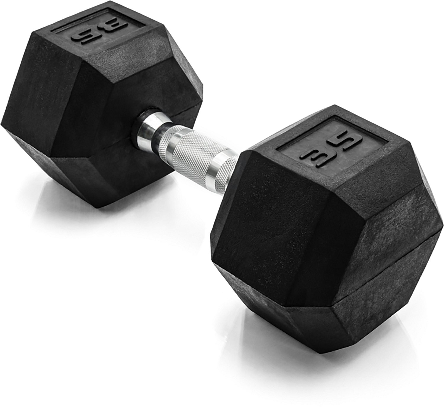 Stay comfortable during your workout by lifting the CAP Barbell 35 lb. Coated Hex Dumbbell. The rubber heads keep the dumbbell from damaging floors, and the ergonomic handle reduces fatigue in your hand and improves comfort. The hex design prevents the dumbbell from rolling.