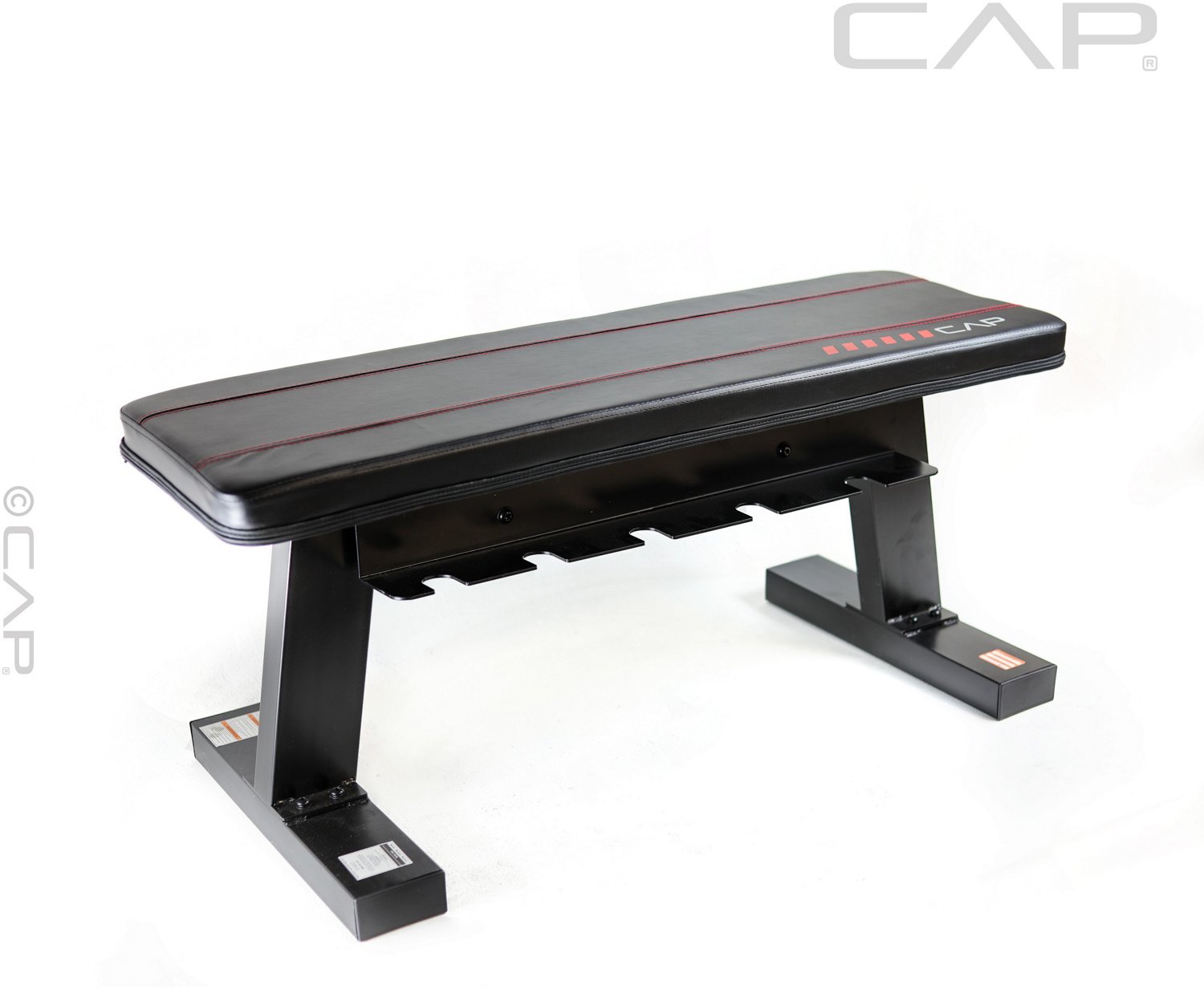 Boost your exercise regiment with the CAP Barbell Flat Bench with Storage. Made of powder-coated steel tubing with zinc hardware, the bench stands up to the most rigorous lifting routines. The double-stitched box pad is comfortable yet firm and durable against wear. It also includes storage for 5 pairs of 5-25 pound dumbbells.
