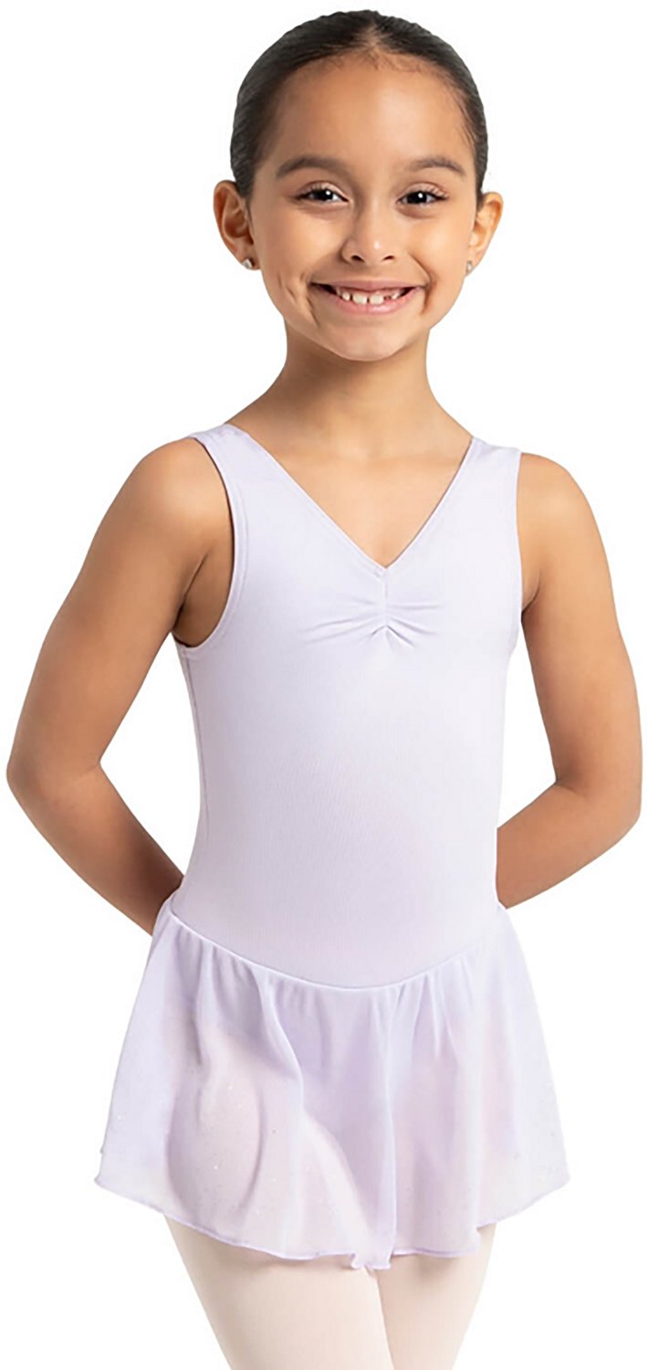 Perform gracefully in the Capezio Girls' V Neck Pinch Front Tank Dress. The body material of nylon and spandex provides resiliency, and the skirt's polyester fabric is designed for frequent use. The full front lining is a reinforcing feature, and the ballet leg line is in place for constant dance movements.