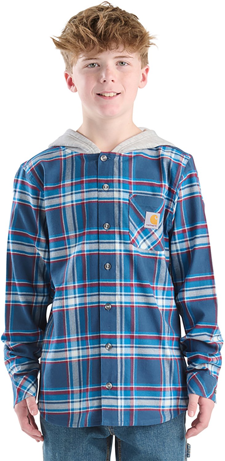Get ready for a cool-weather adventure when you put on the Carhartt Boys' Flannel Long Sleeve Hooded Shirt. This sweatshirt is made of 100% cotton with a cotton and polyester hood to keep you warm and protected, and the relaxed fit helps you feel good wherever the day takes you.