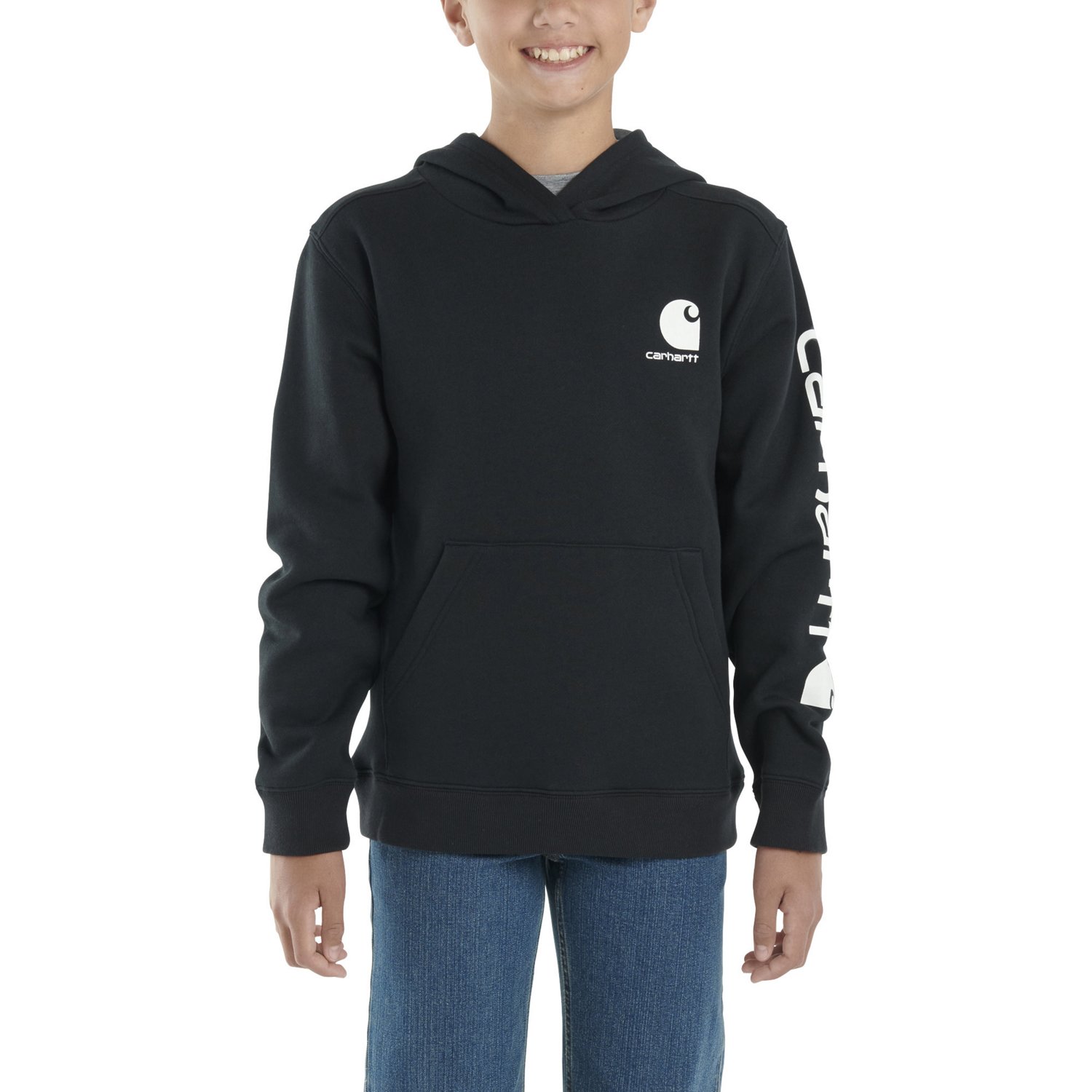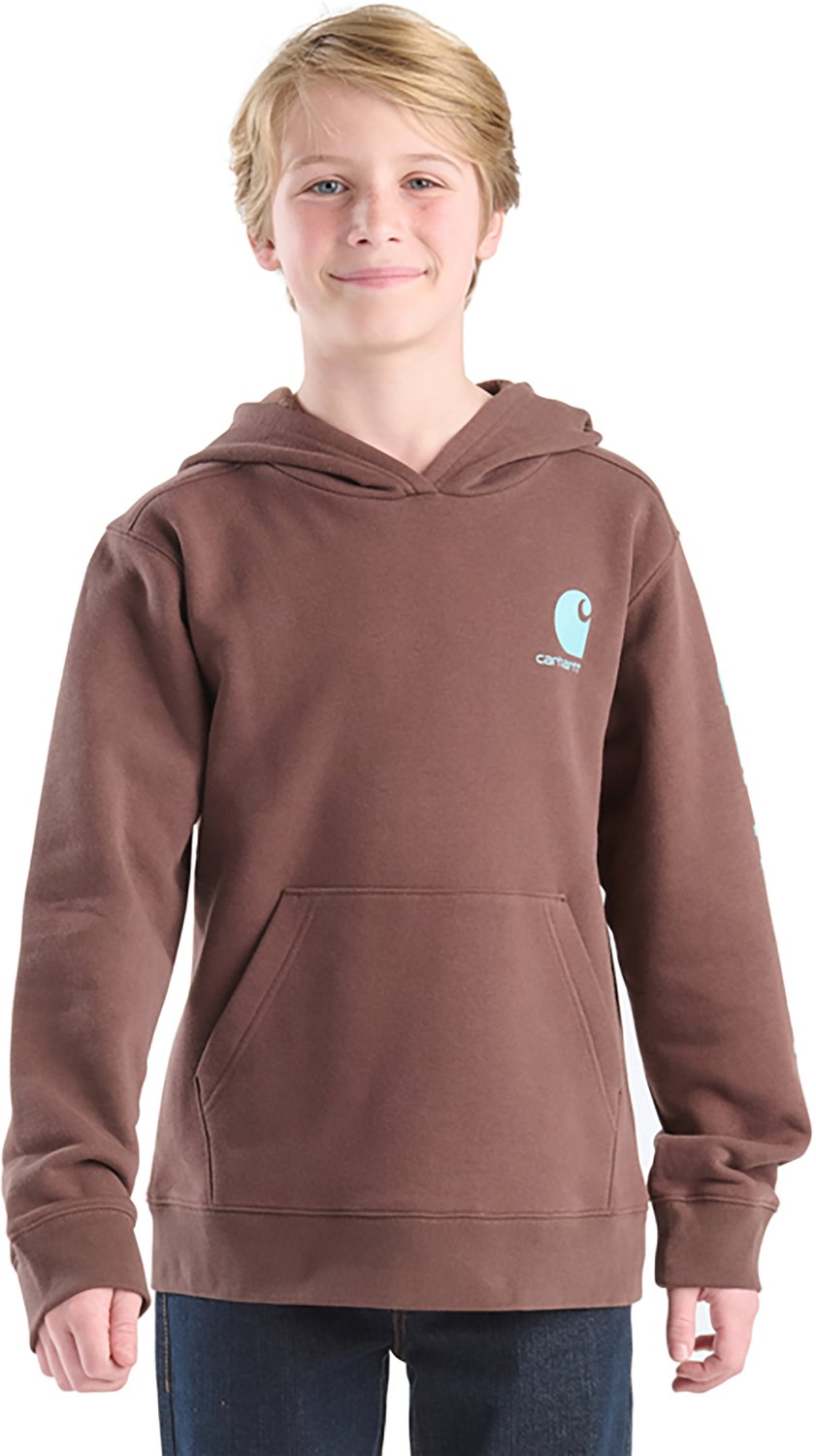 Your son will remain comfortable wearing the Carhartt Boys' Logo Pullover Hoodie. The midweight polyester and cotton blend provides comfort and warmth, while the hood and ribbed hem provide added warmth. The Carhartt branding adds a stylish touch.