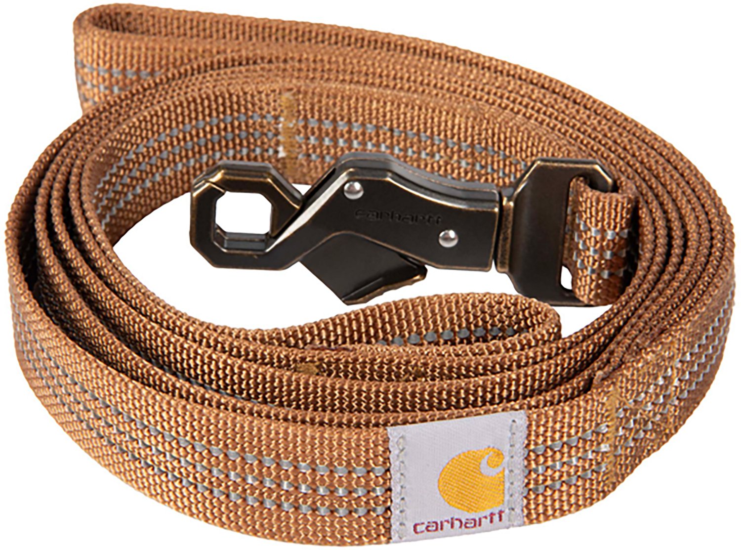 Manage your furry best friend's movement more effectively using this Carhartt Dog Leash, featuring 1 reinforced and 1 traffic handle for reliable use in both open and tighter spaces. The 600-denier nylon construction and adjustable metal D-ring withstand pulls, and a metal trigger claw clasp ensures the leash stays securely connected. The leash even remains visible in low light, thanks to reflective details.