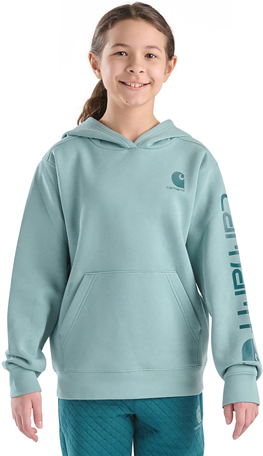 Stay cozy with the Carhartt Girls' Graphic Hoodie. The cotton and polyester fleece material provides a warm and comfortable feel, while the hood offers coverage. The screen-printed logos deliver a stylish touch.