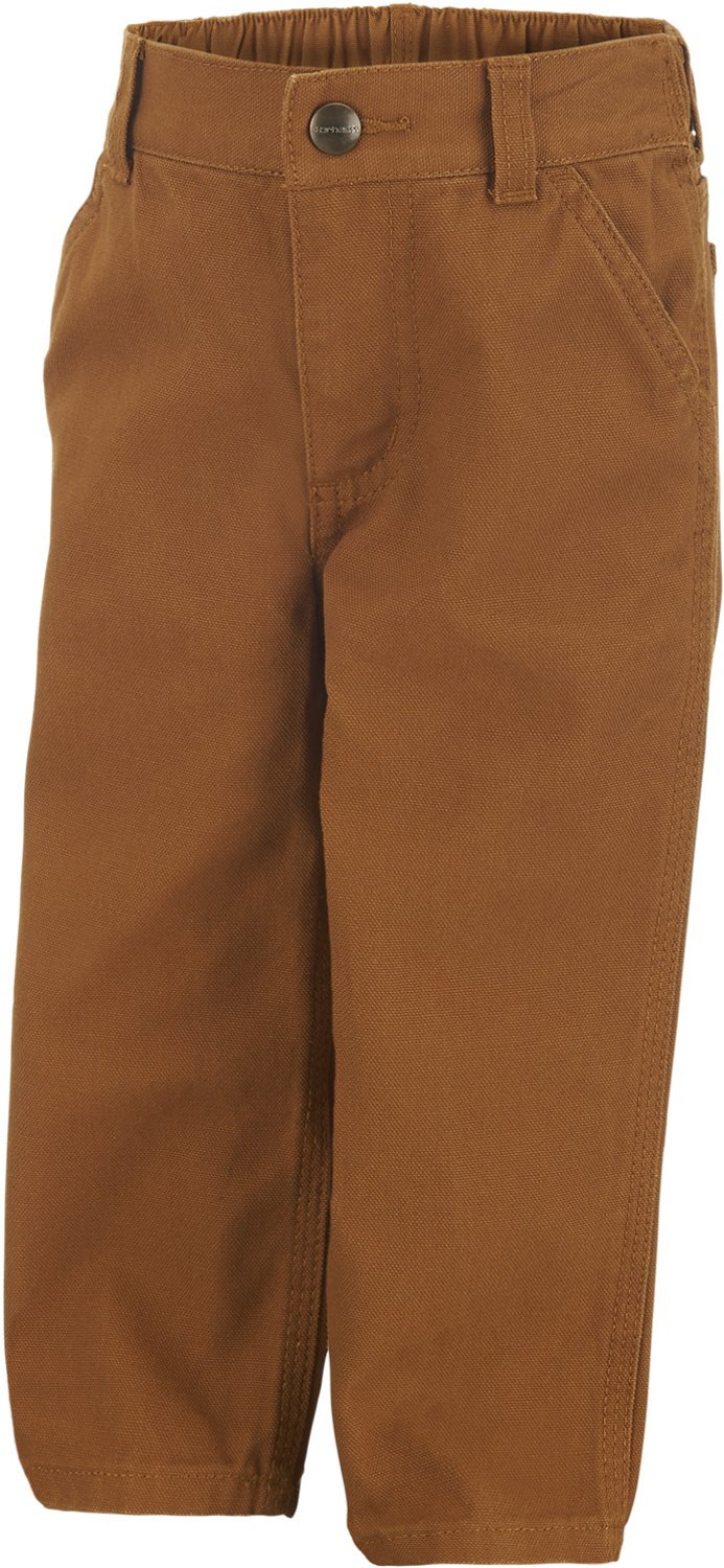 He can wear the Carhartt Infant Boys' Canvas Dungaree Pants to school or at home for a classic look. Crafted from 100% cotton canvas material, these pants provide a comfortable feel all day long, while the triple-stitched seams offer durability. The snap button closure and adjustable waist help ensure a secure fit. Multiple tool pockets.