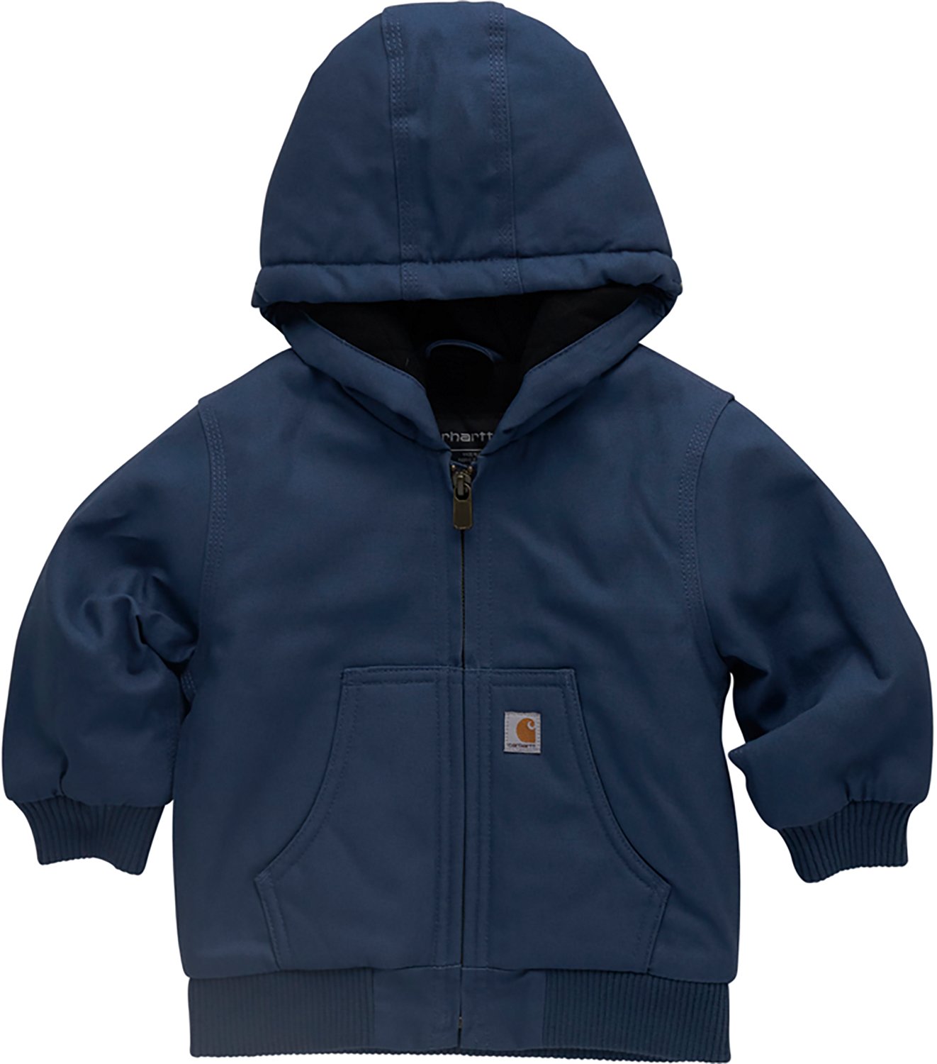 This Carhartt Infants' Active Jacket is sure to keep your little one warm and toasty when temperatures drop. The cozy heavyweight, 9-ounce 100% cotton canvas construction works together with 100% polyester insulation and a brushed tricot lining, providing reliable protection from the cold. Quilted taffeta sleeves make bundling him up easy.