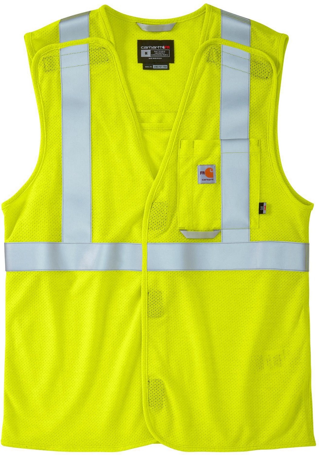 Stay protected and seen in the Carhartt Men's Flame Resistant High Visibility Mesh Class2 Vest. The 50% modacrylic, 30% lyocell, 10% aramid and 10% nylon mesh construction offers a long-lasting and ventilated feel, and the flame-resistant design helps keep you safe. The locker loop allows you to hang certain belongings, and the high-visibility technology ensures you'll be visible in any light.