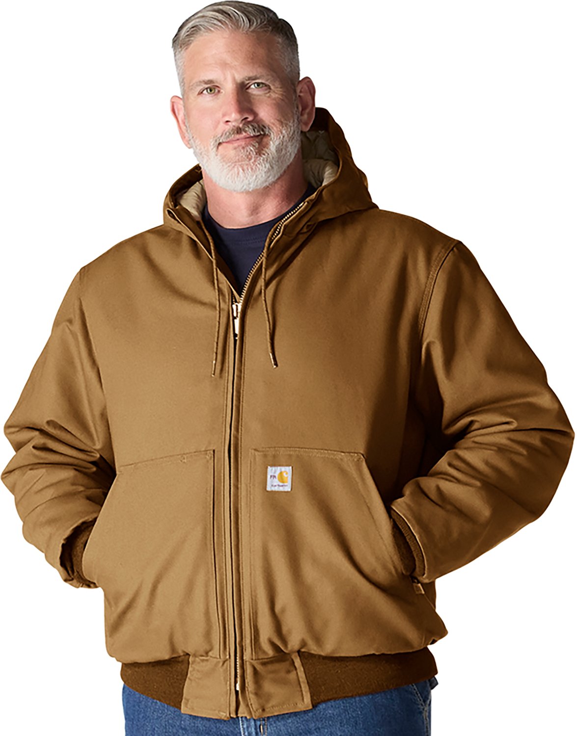 Look your best when you wear the Carhartt Men's Flame Resistant Loose Fit Duck Insulated Active Jacket. It is made of 100% cotton FR duck. The 100% FR modacrylic resin insulation improves warmth, and its inner and outer hook-and-loop storm flaps provide electric-arc protection. The Carhartt FR label sewn on front pocket adds an official touch.