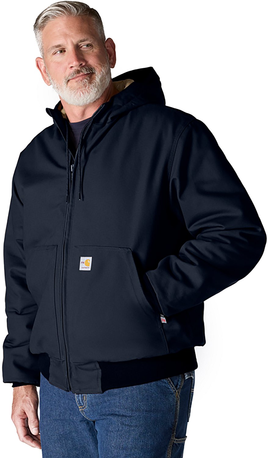 Look your best when you wear the Carhartt Men's Flame Resistant Loose Fit Duck Insulated Active Jacket. It is made of 100% cotton FR duck. The 100% FR modacrylic resin insulation improves warmth, and its inner and outer hook-and-loop storm flaps provide electric-arc protection. The Carhartt FR label sewn on front pocket adds an official touch.