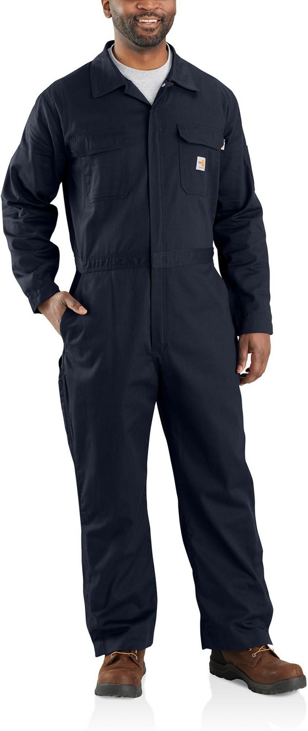 Equip yourself for any job with the Carhartt Men's Flame Resistant Loose Fit Twill Coverall. The durable twill fabric is flame-resistant to NFPA 70E and NFPA 2112 standards, right down to the heat-resistant zipper taping. The flexible waist and pleated back yoke maximize freedom of movement, while leg openings fit comfortably over your boots.