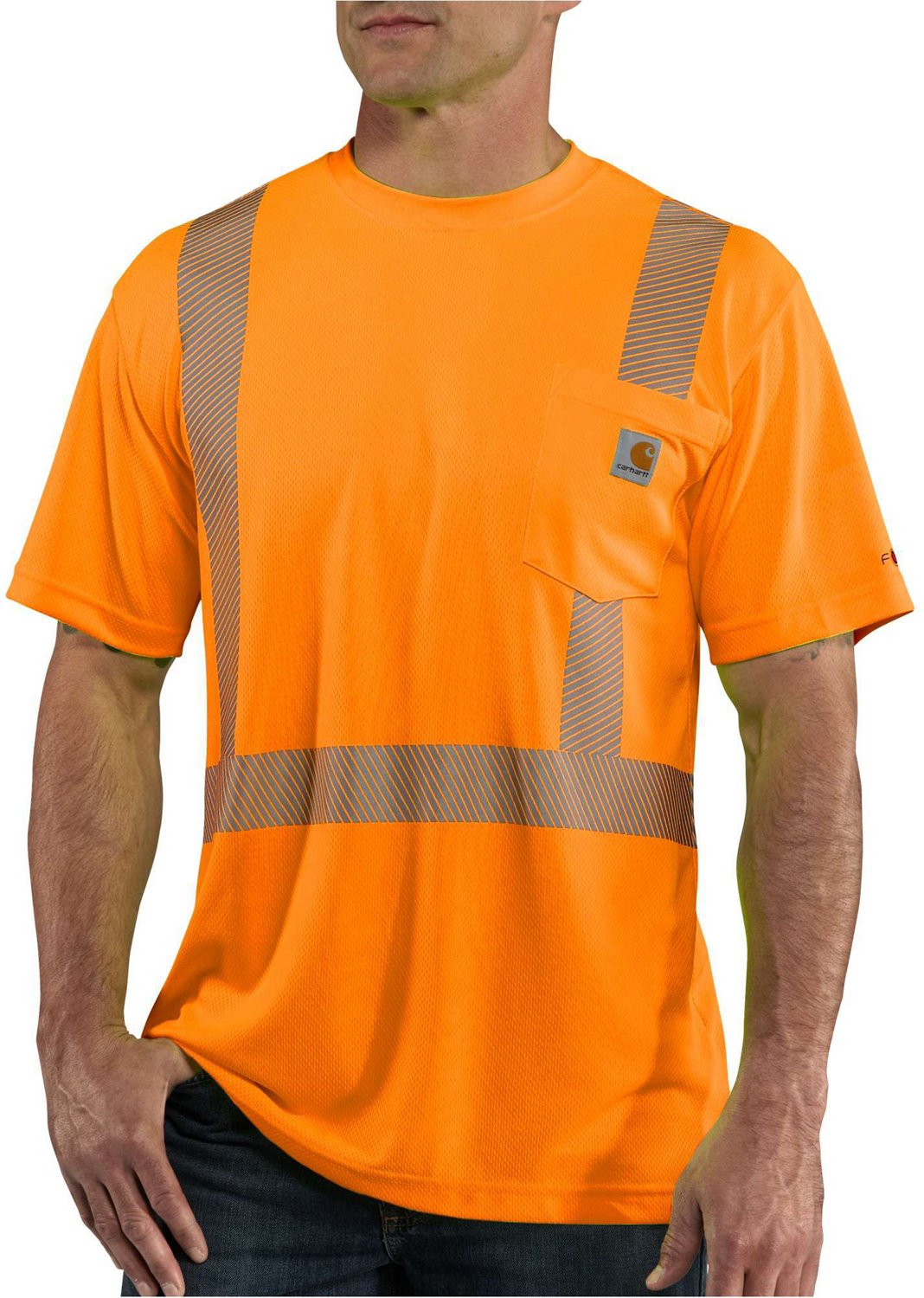 Stay visible on the jobsite in the Carhartt Men's Force® High Visibility Class 2 Short Sleeve T-shirt, which is made of 100% polyester knit with 3Mâ„¢ Scotchliteâ„¢ Reflective Material that enhances visibility in low-light conditions. FastDry® moisture-wicking fabric technology helps keep you dry, while Stain Breakerâ„¢ fabric technology release stains for easy cleaning. Meets ANSI/ISEA 107-2010 standards. Crew neck.
