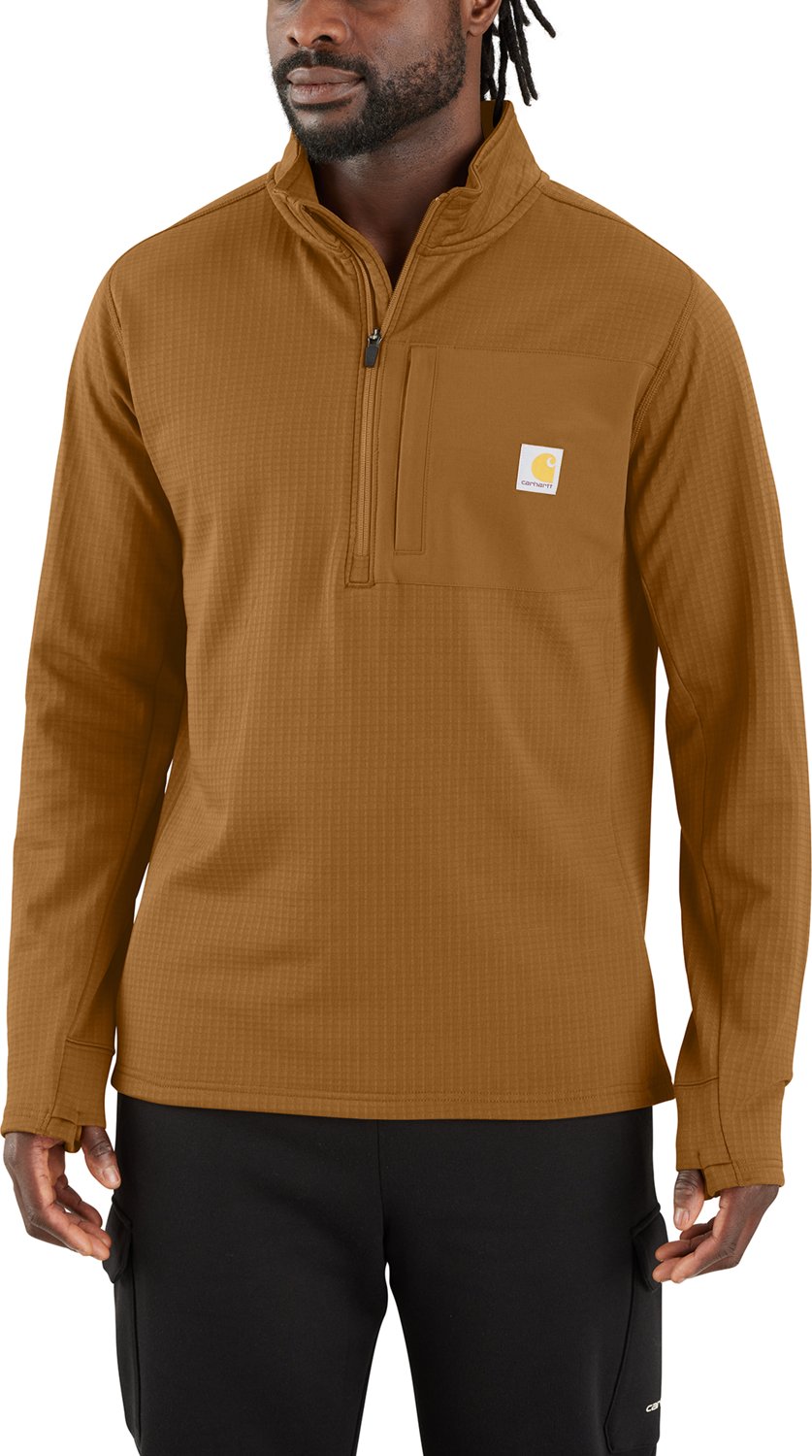 Focus on the job with the Carhartt Men's Force Relaxed Fit 1/2-Zip Sweatshirt. The polyester and elastane grid fleece fabric provides a warm and comfortable feel, while the Grid-Back fleece promotes breathability. Carhartt Force and FastDry technology fights odors and wick away sweat to keep you cool, dry and fresh.