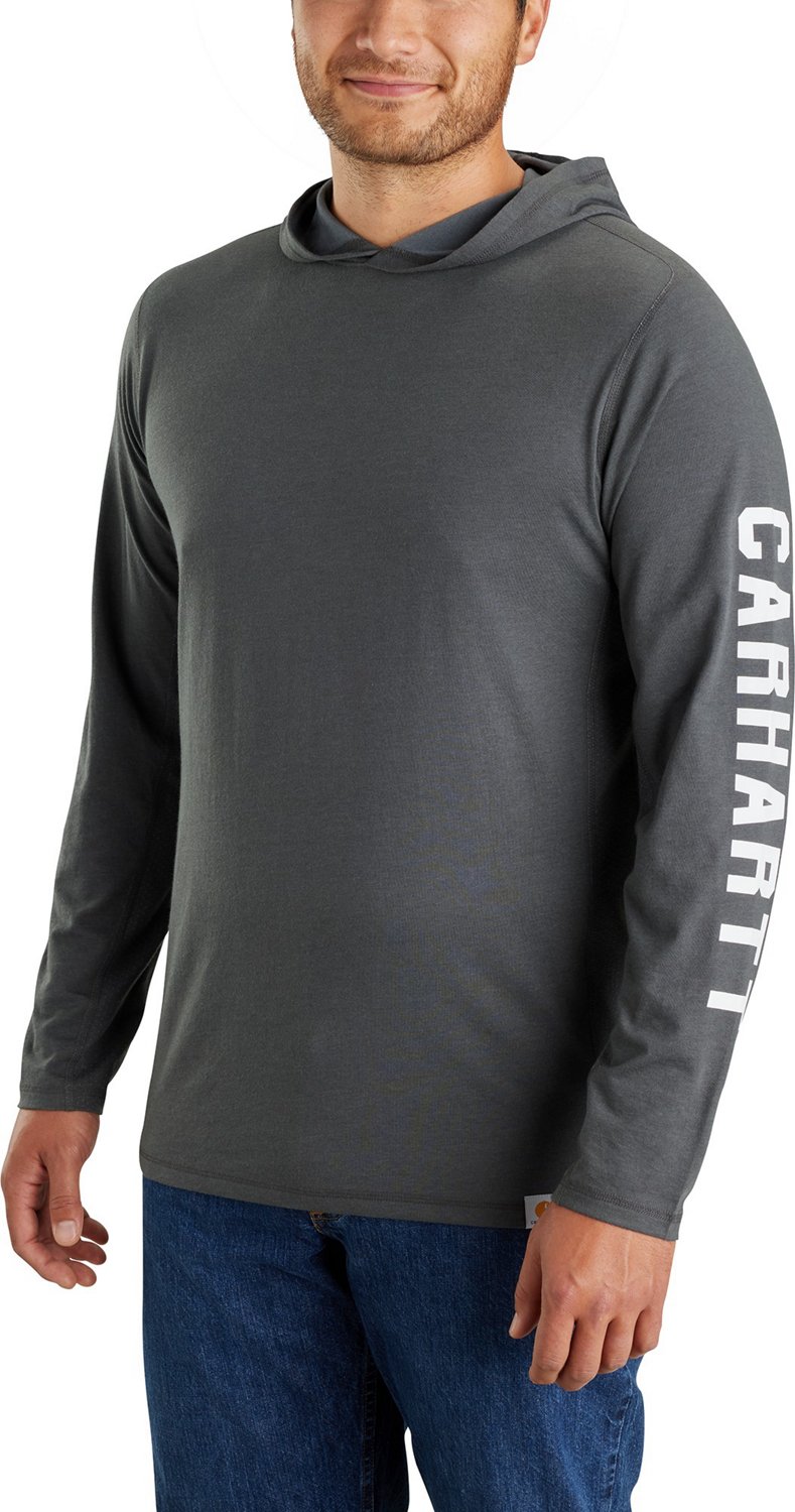 When you need an extra layer, pull on the Carhartt Men's Force Relaxed Fit Midweight Logo Graphic Hooded Long Sleeve T-shirt. Midweight cotton blend fabric delivers softness, while Force® and FastDry® technologies help keep you sweat- and odor-free. UPF technology blocks UV rays, and the hood and droptail hem offer extra coverage.