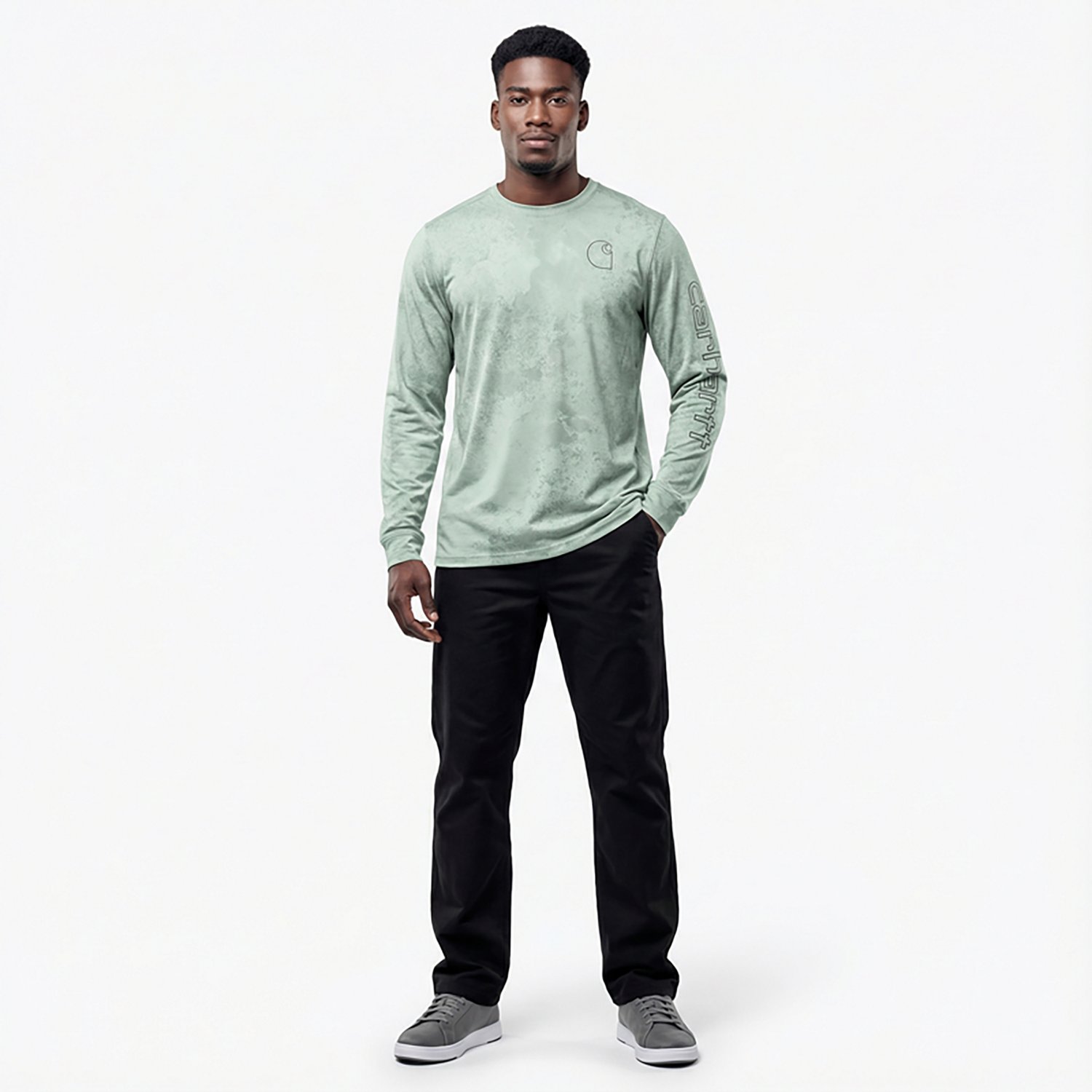 Work hard in the Carhartt Men's Force Sun Defender Long Sleeve Graphic T-shirt. The polyester jersey fabric provides a comfortable feel, while the FastDry technology wicks away sweat to keep you cool and dry. Sun Defender UPF 50+ protection shields against harmful UV rays, and the allover watercolor camouflage print and Carhartt graphics deliver a stylish touch.